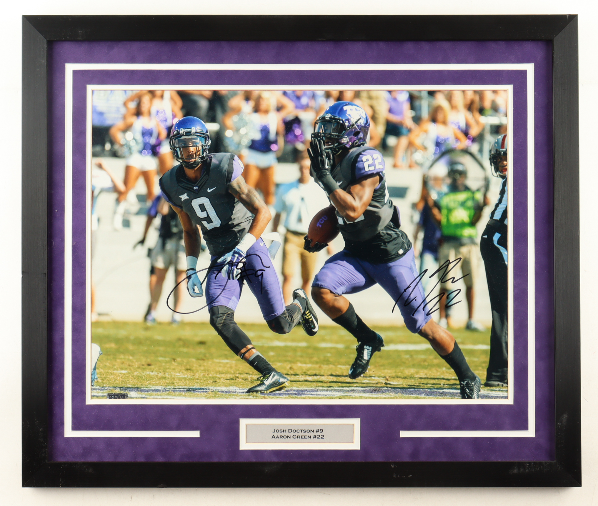 Custom frame measures approximately 22" x 26" in size and features a Photo that has been hand-signed by Josh Doctson and Aaron Green (TCU Horned Frogs). Please note the framing is scuffed, see photo for more details.