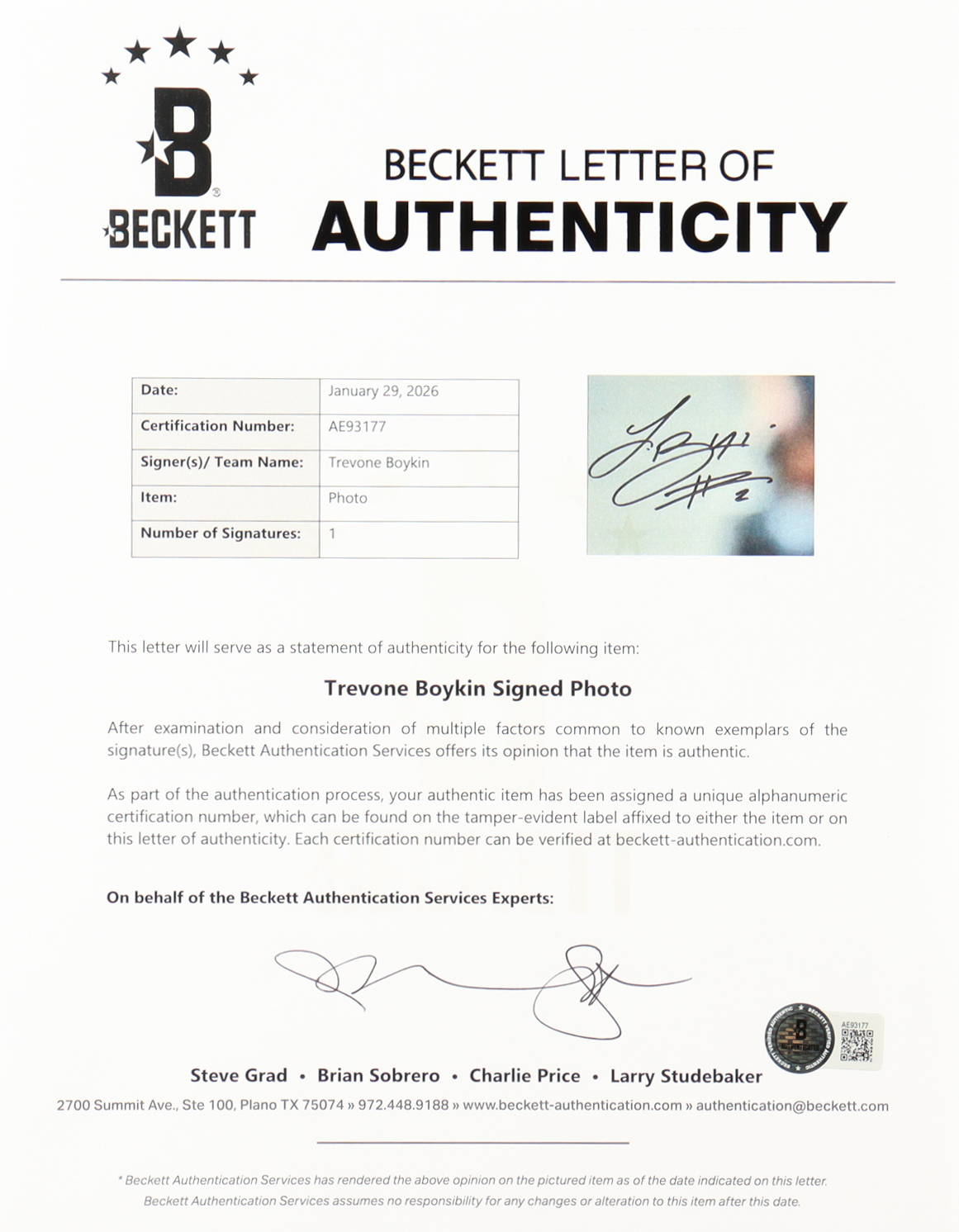 Custom frame measures approximately 22" x 26" in size and features a photo that has been hand-signed by Trevone Boykin. Please note, there is scuffing throughout the frame.