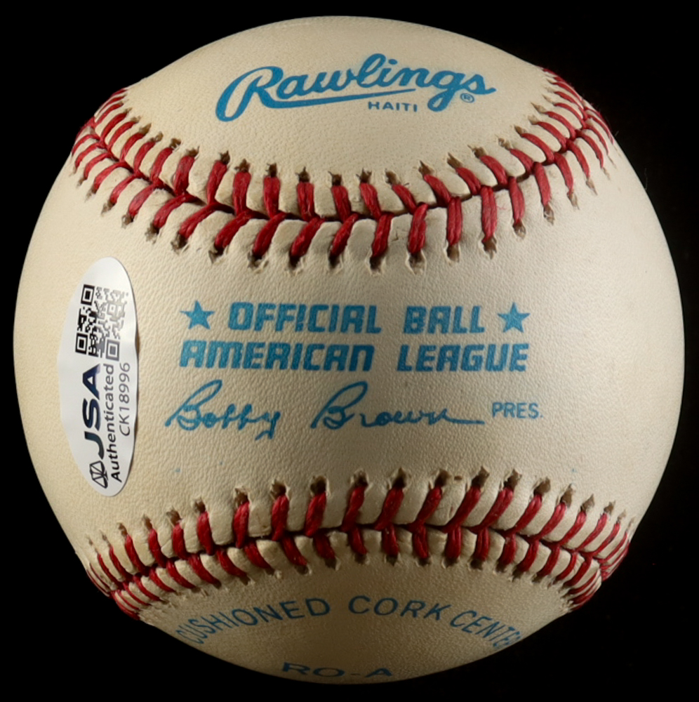 Rawlings Official American League baseball. Hand-signed by Yogi Berra (D. 2015, New York Yankees, HOF) and Don Larsen (D. 2020, New York Yankees). Please note, the baseball is naturally toned and has stains throughout.