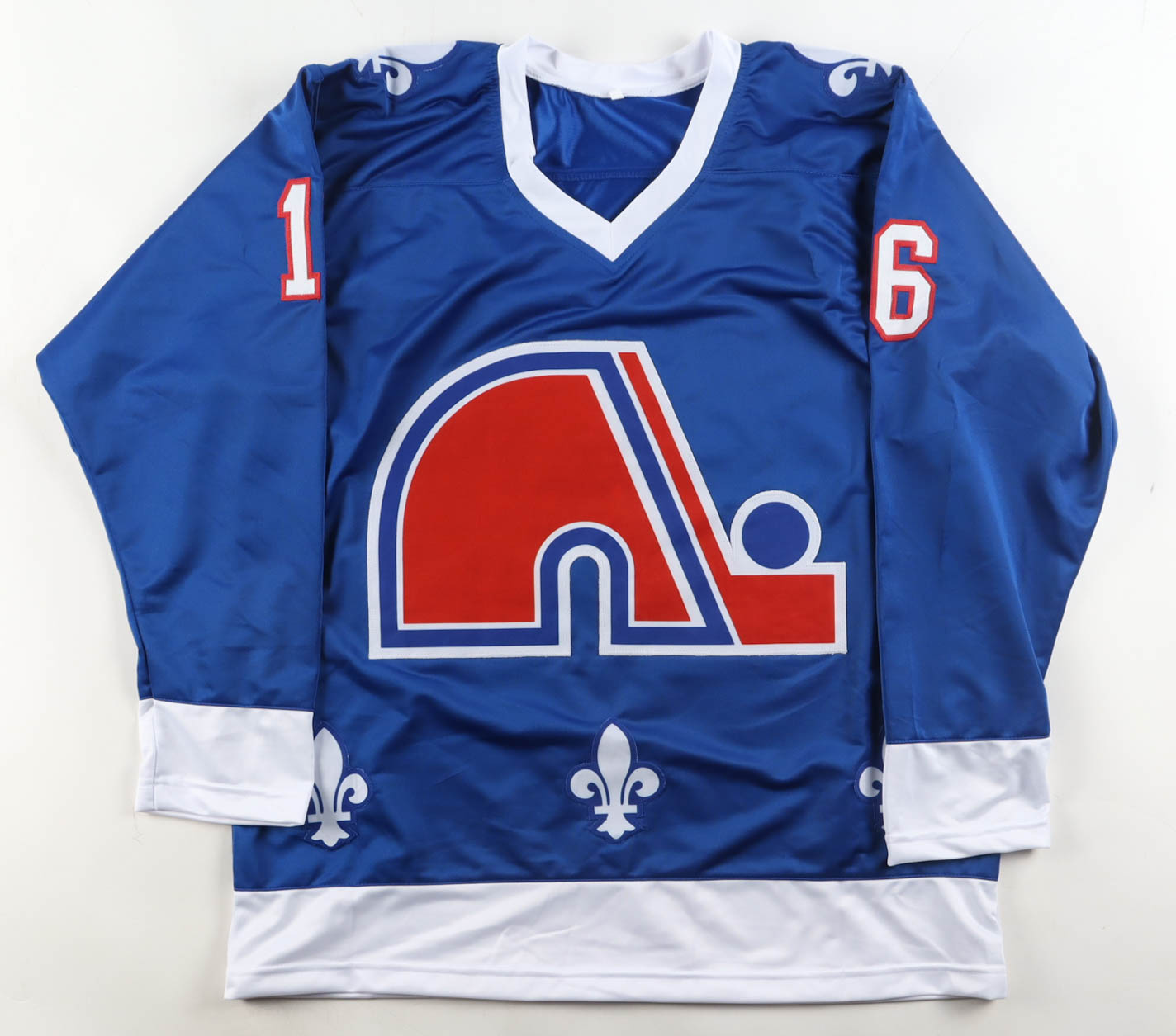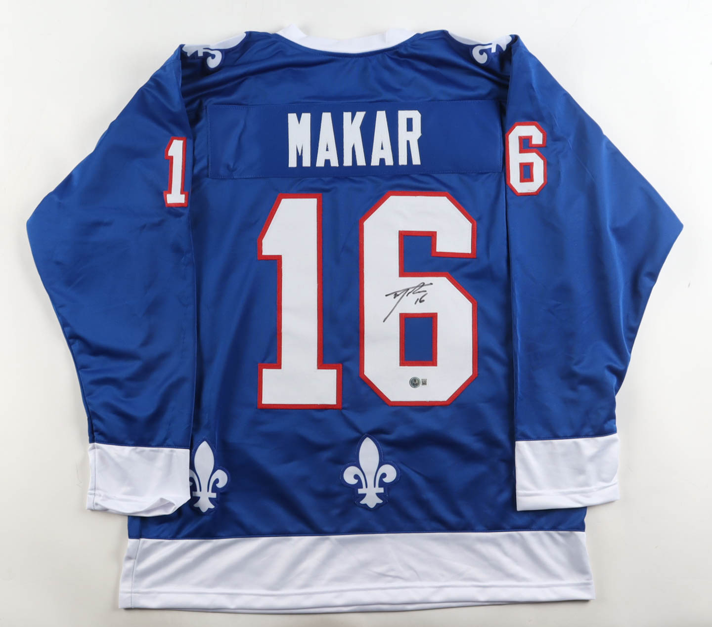Custom jersey with everything sewn on, size XL. Hand-signed by Taylor Makar (Quebec Nordiques).