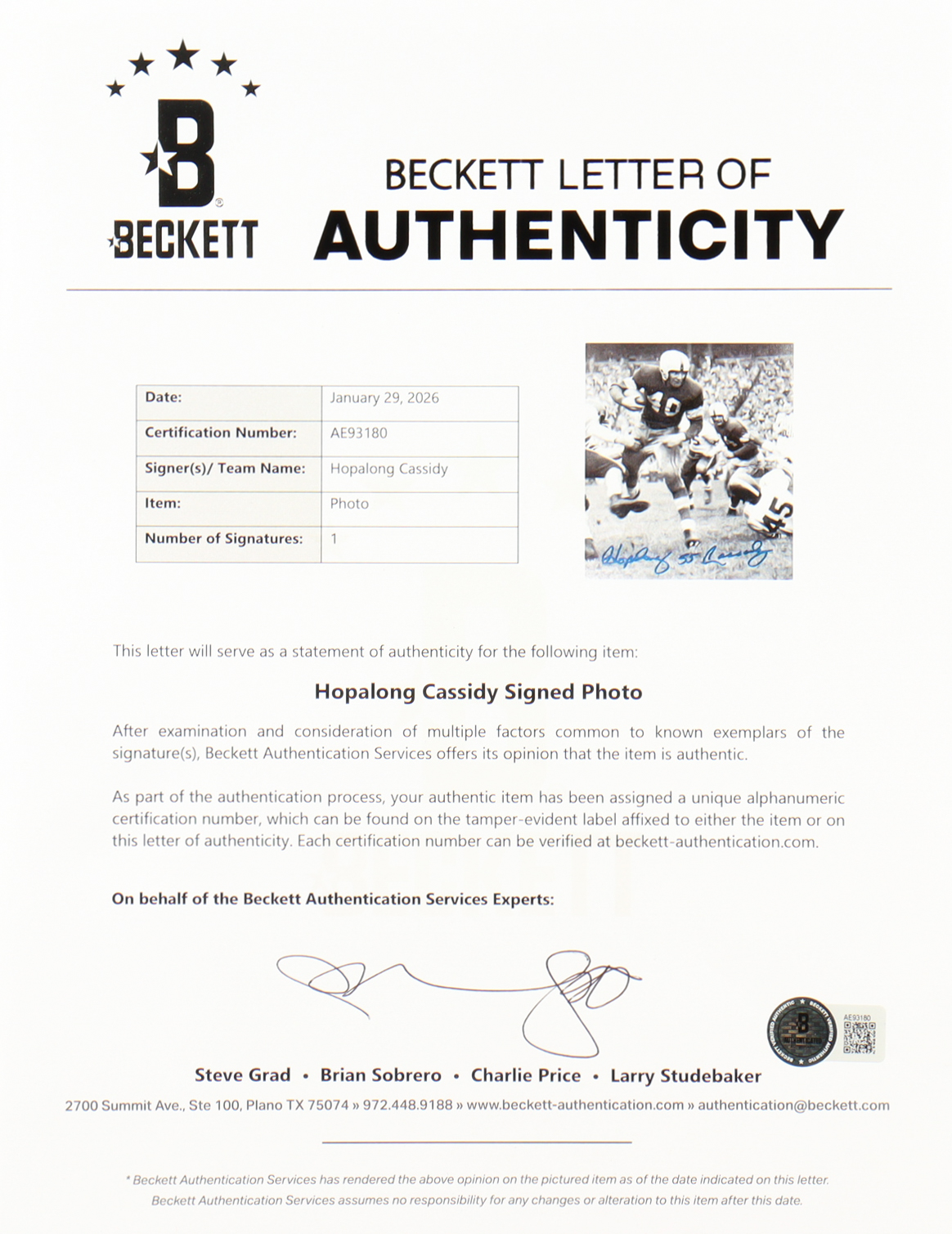 The autograph includes an official Beckett Authentication Services hologram and matching LOA for authenticity purposes.