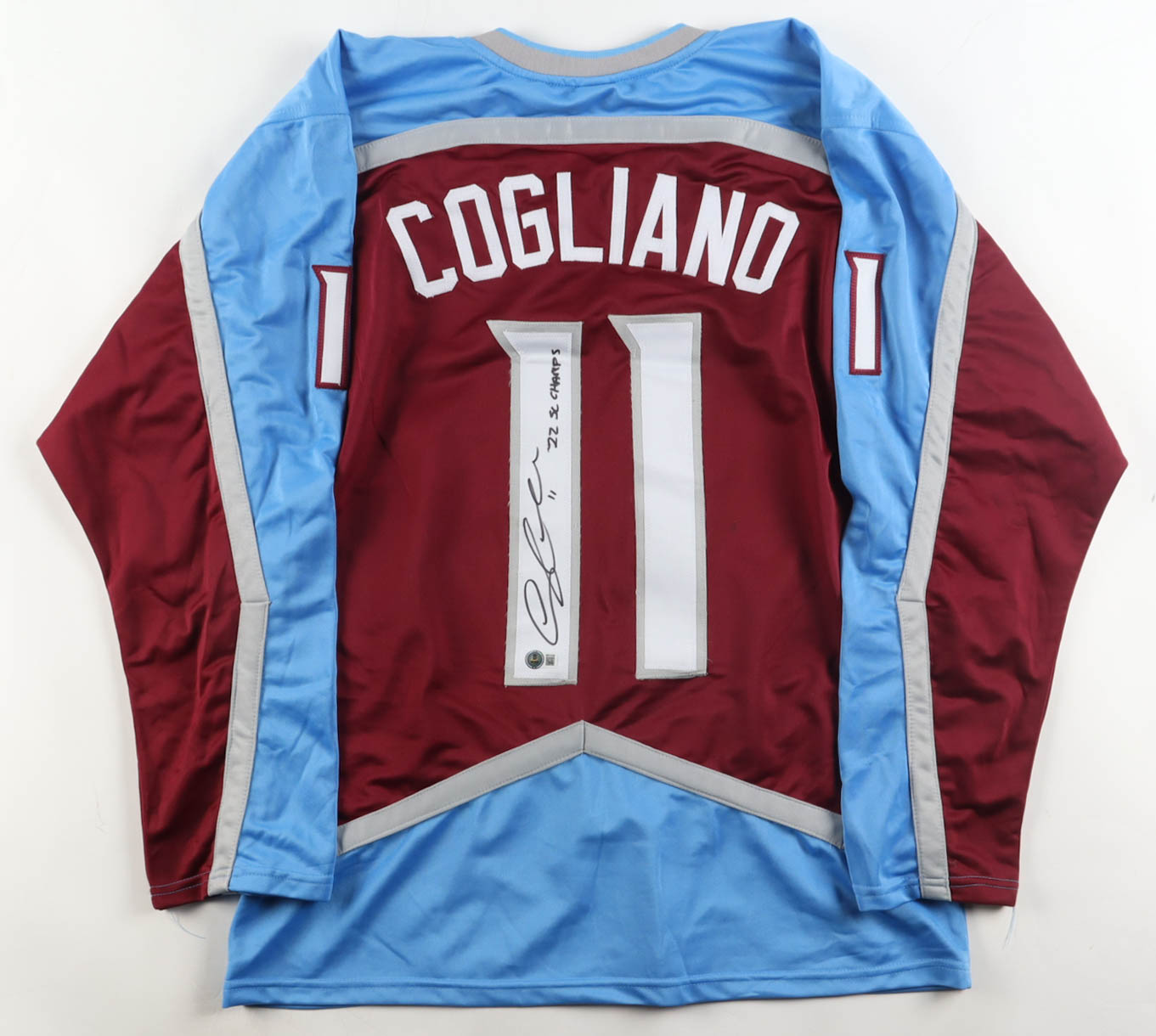 Custom jersey with everything sewn on, size XL. Hand-signed and inscribed by Andrew Cogliano (Colorado Avalanche).