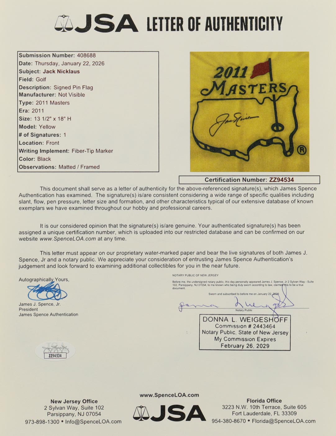 Jack Nicklaus Signed Custom Framed Masters Tournament Golf Pin Flag Display (JSA)