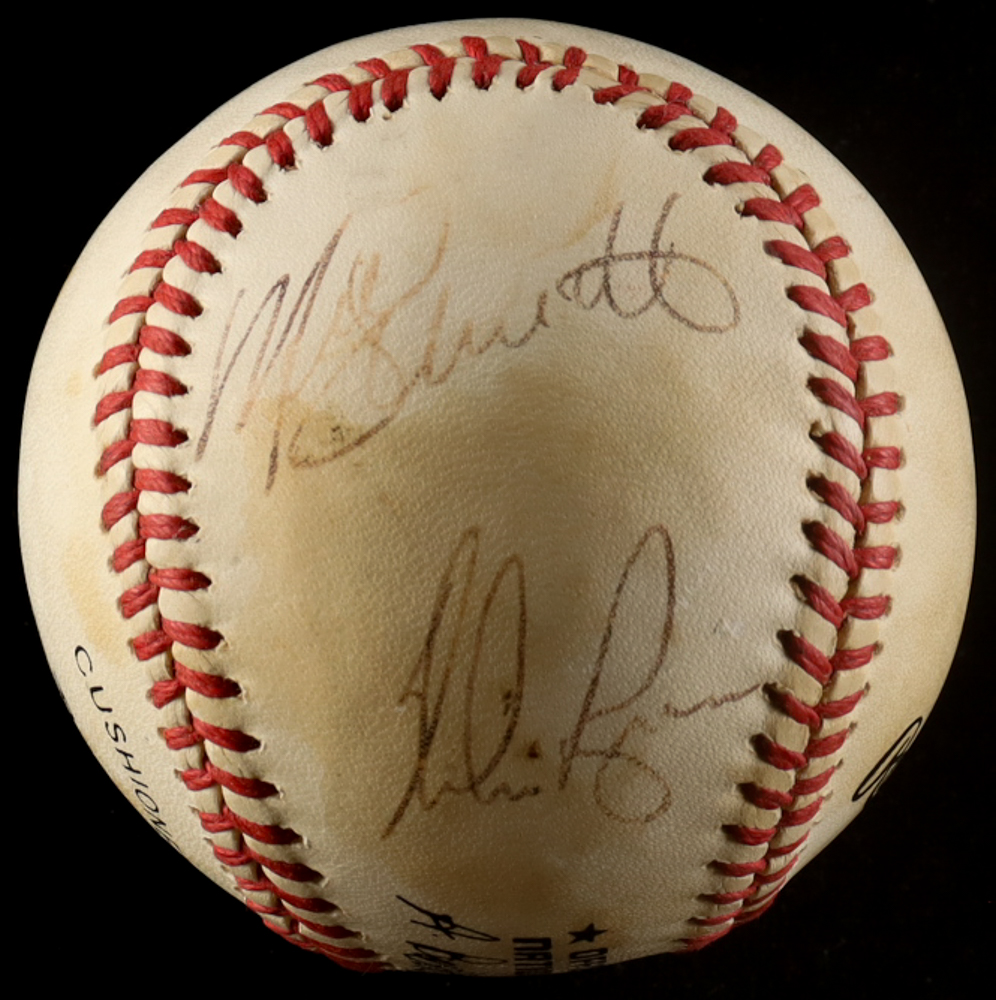 Rawlings Official National League Baseball. Hand-signed by Yogi Berra (D. 2015, New York Yankees, HOF), Nolan Ryan (New York Mets, HOF) and Mike Schmidt (Philadelphia Phillies, HOF). Please note, the baseball is naturally toned and stained.