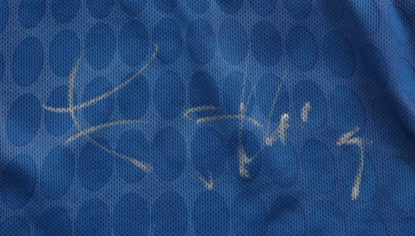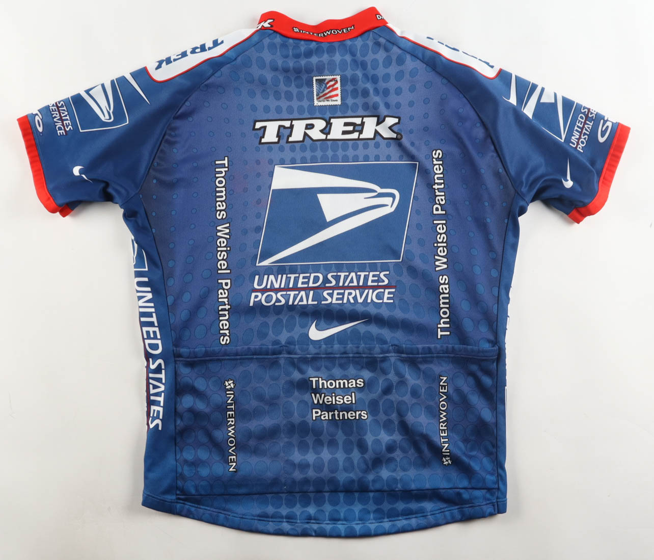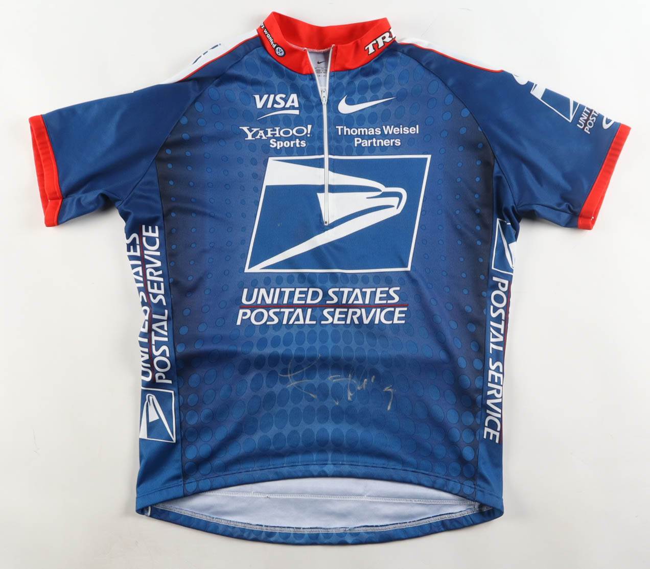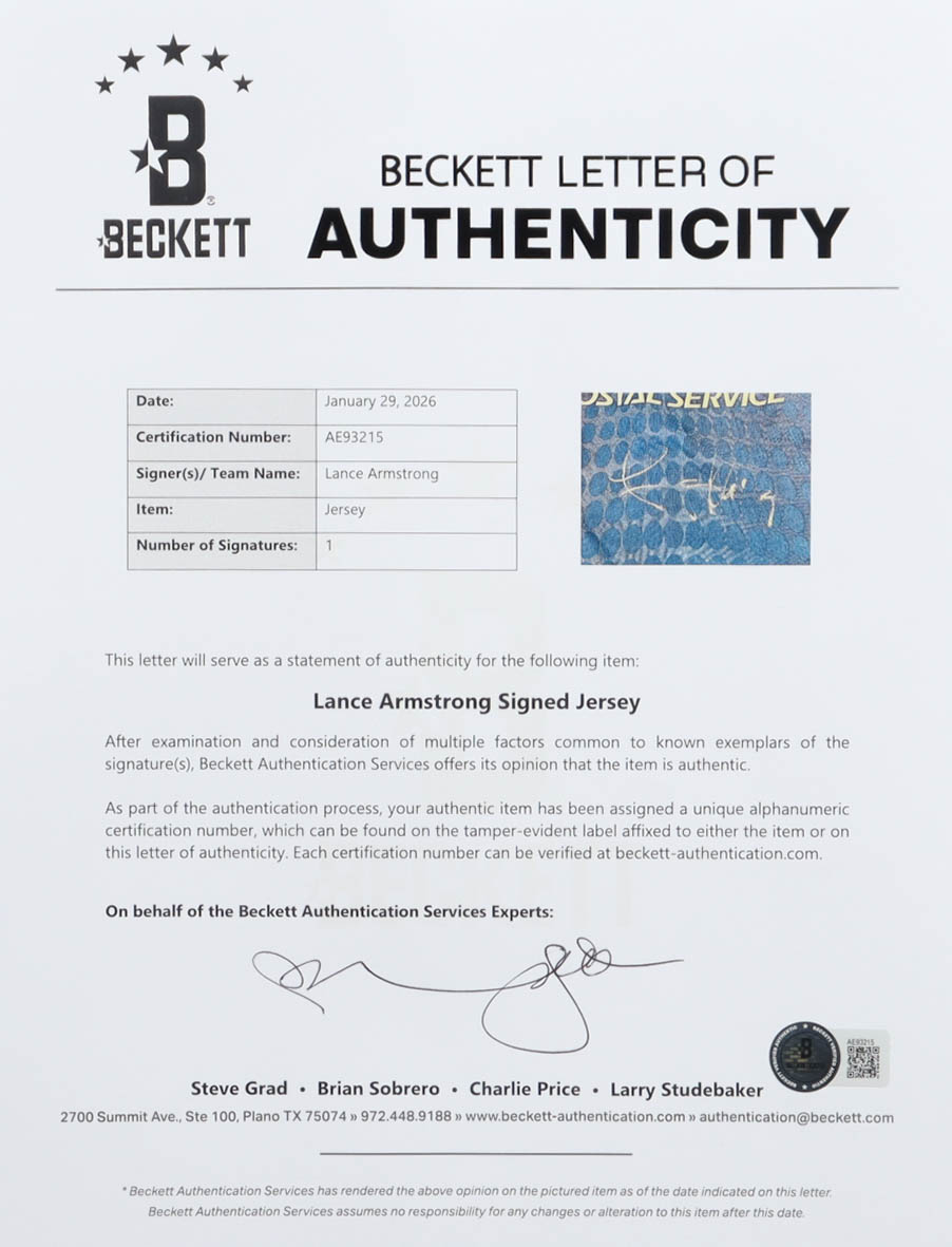 Nike authentic jersey with everything printed on, size XL. Hand-signed by Lance Armstrong.