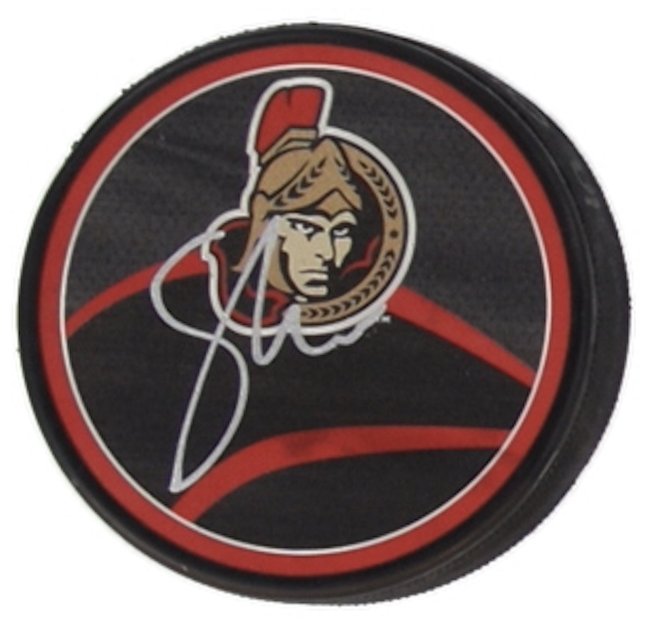 Ottawa Senators logo hockey puck has been hand-signed by Tim Stutzle.