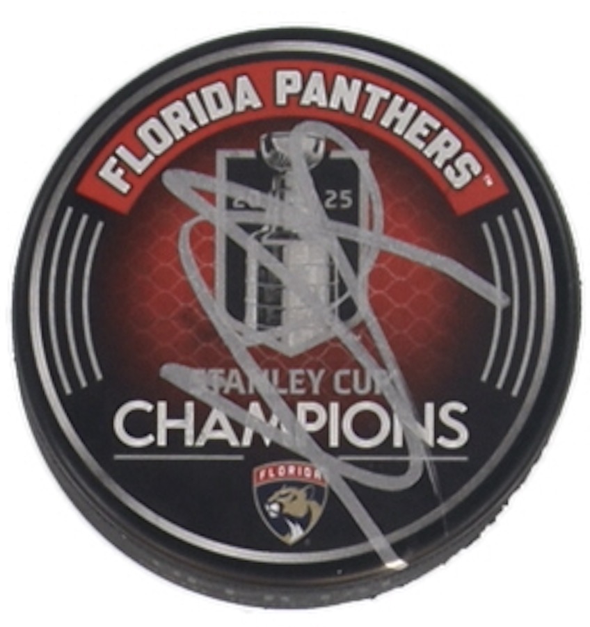Florida Panthers 2024-25 Stanley Cup Champions logo hockey puck. Hand-signed by Seth Jones.