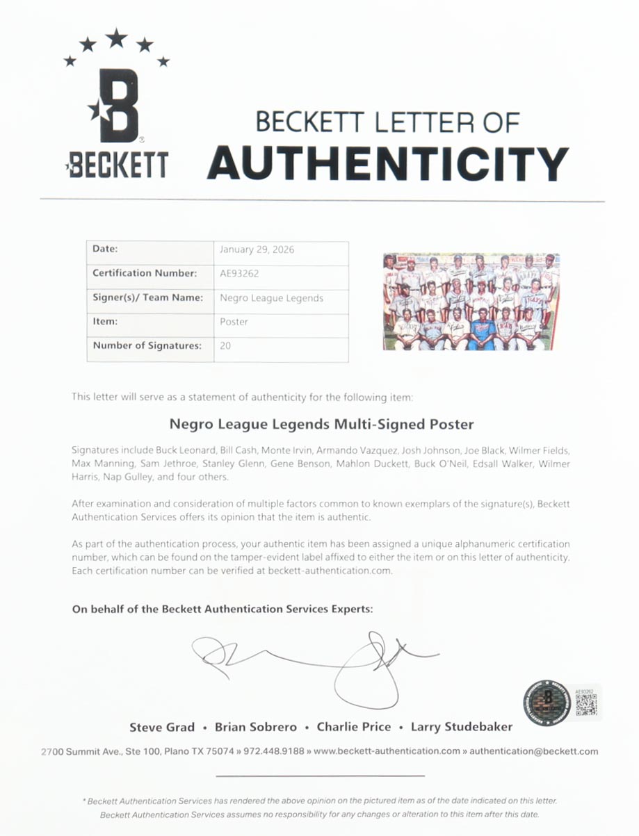 Custom framed photo measures 30" x 37". Hand-signed by (20) with Buck Leonard, Bill Cash, Monte Irvin, Armando Vazquez, Josh Johnson, Joe Black, Wilmer Fields, Max Manning, Sam Jethroe, Stanley Glenn, Gene Benson, Mahlon Duckett, Buck O'Neil, Edsall Walker, Wilmer Harris, Nap Gulley, and four others. Please note the framing is scuffed, see photos for more details.