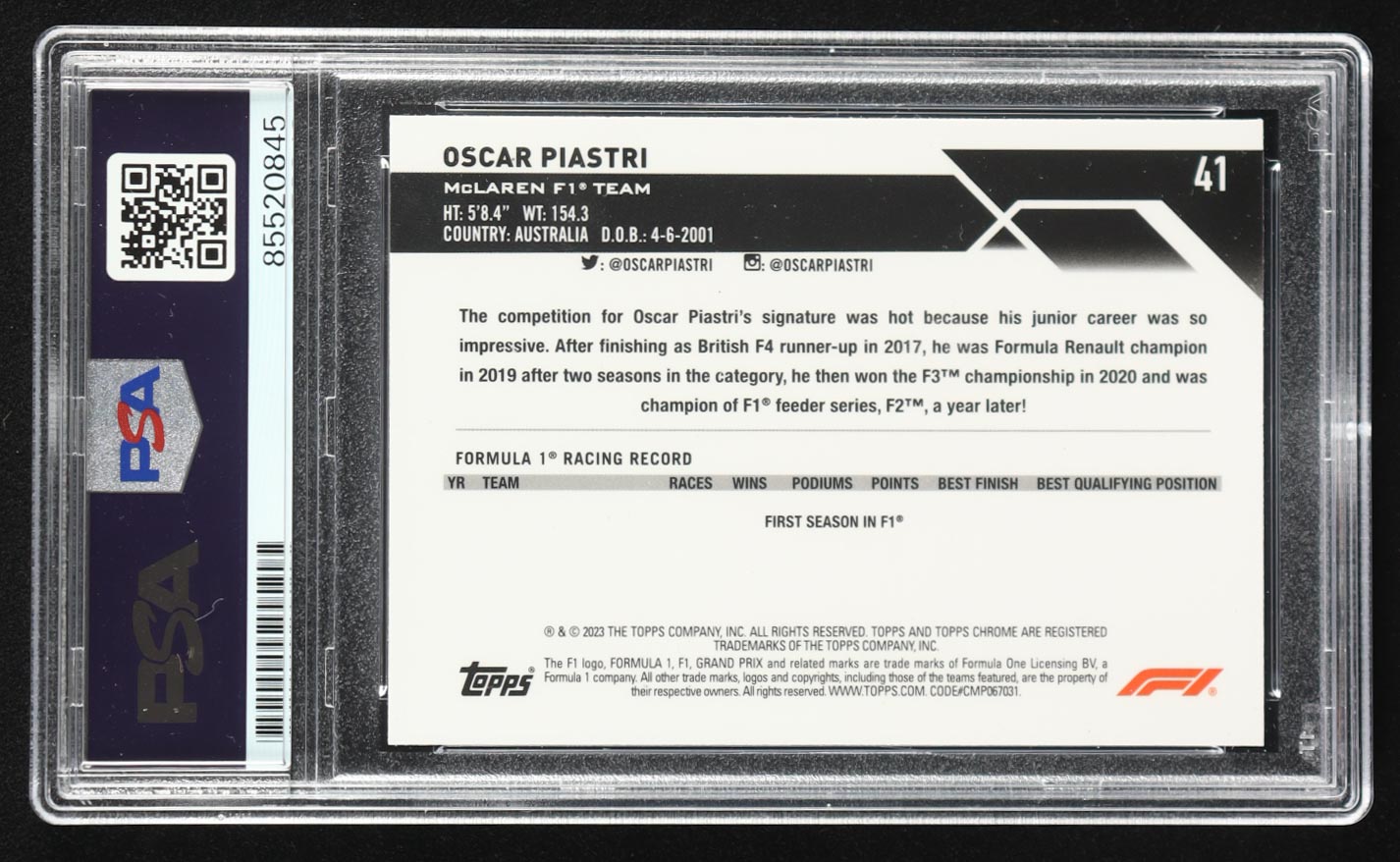 Oscar Piastri Signed 2023 Topps Chrome Formula 1 #41 RC (PSA)