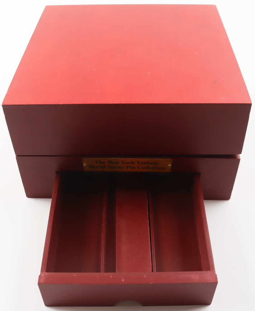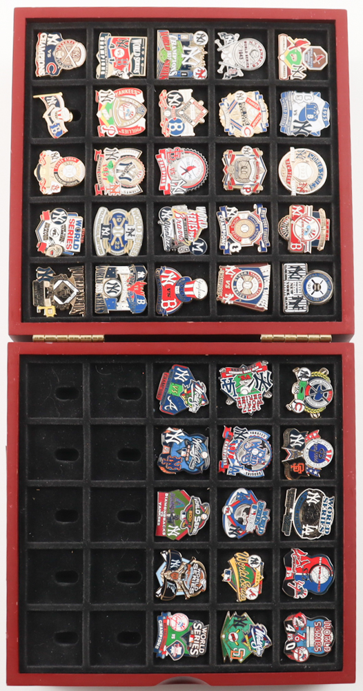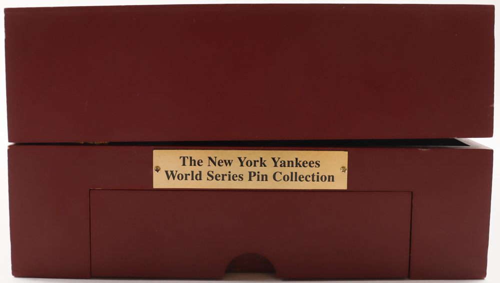New York Yankees World Series commemorative pin set includes (40) pins. Includes display case as shown. Please see photos for more details regarding the condition of the item. Note that the item is unsigned.
