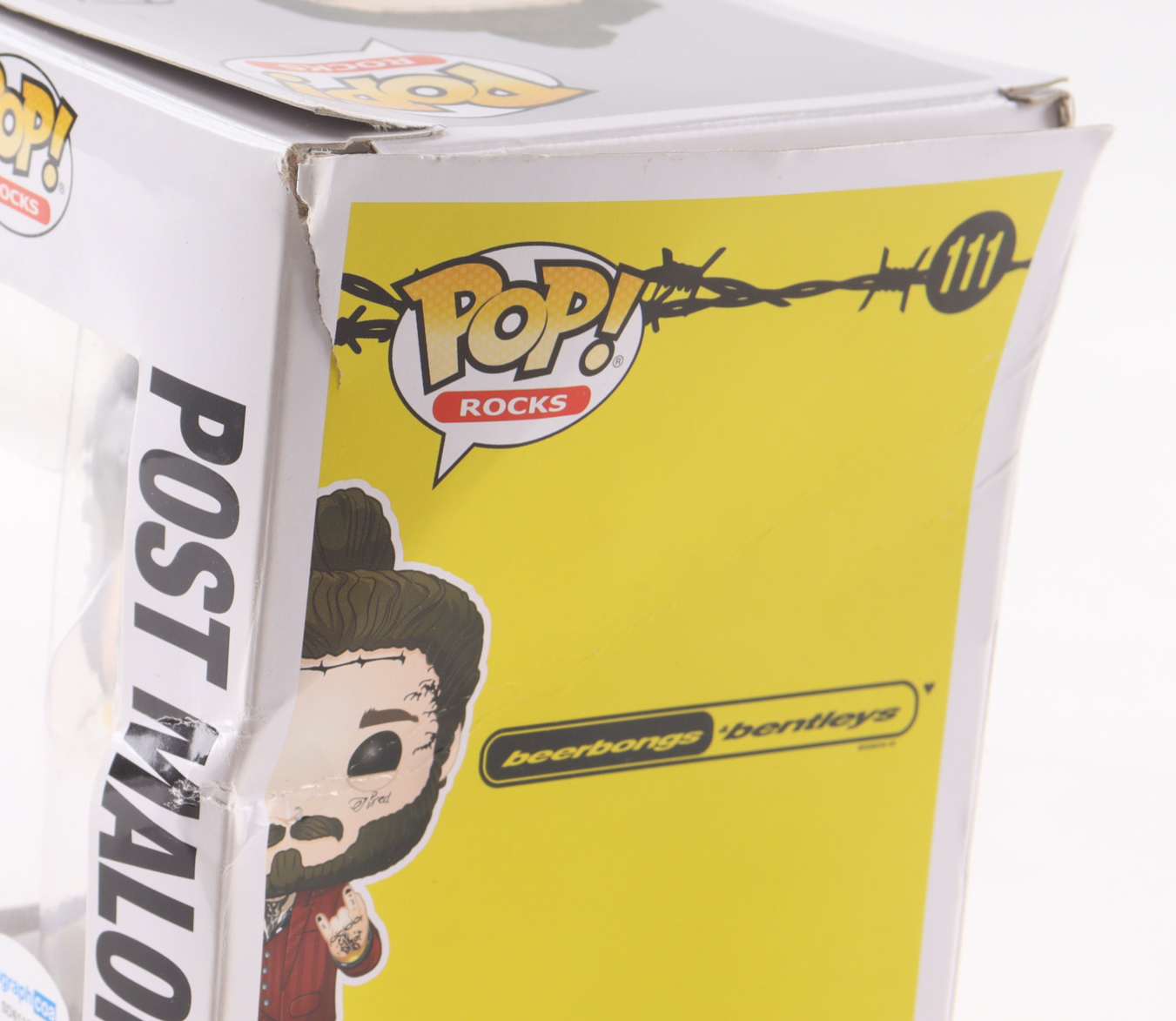 Vinyl figure measures approximately 4" tall and has been hand-signed by Post Malone. Please note, item has been window swapped and there is damage throughout the packaging - see photos for more detail.