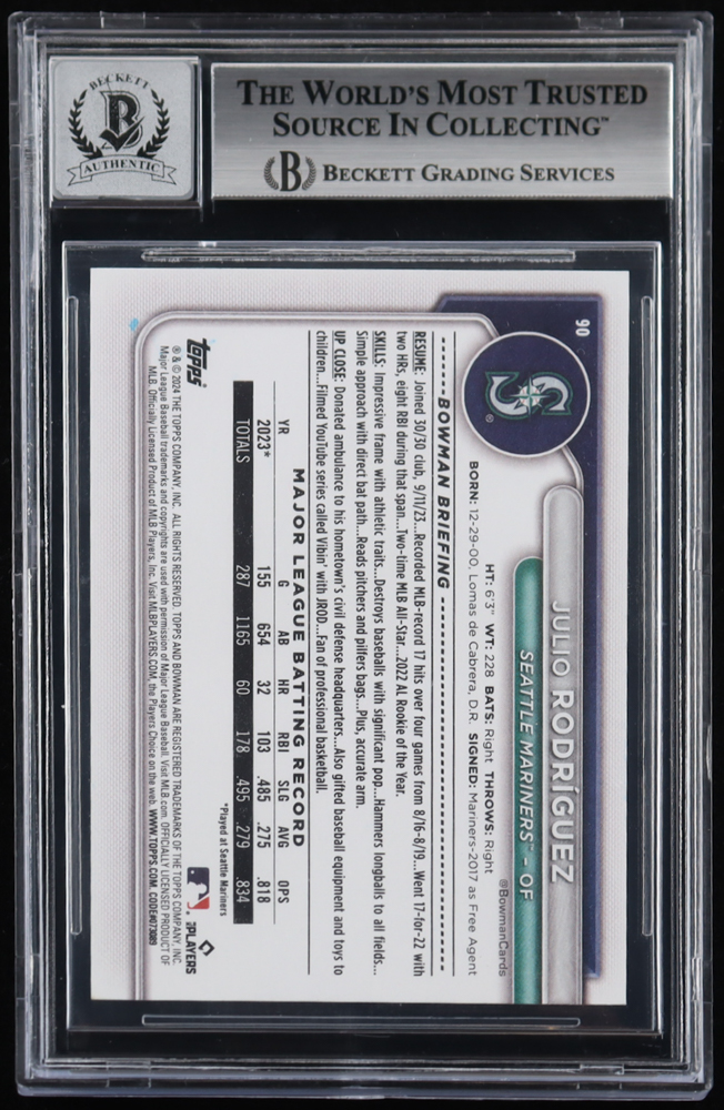 Julio Rodriguez Signed 2024 Bowman #90 (BGS | Auto Grade 10)