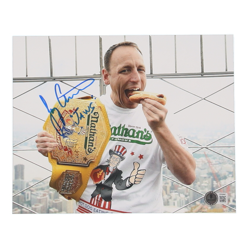 Photo measures 8" x 10" in size and has been hand-signed and inscribed by Joey Chestnut.