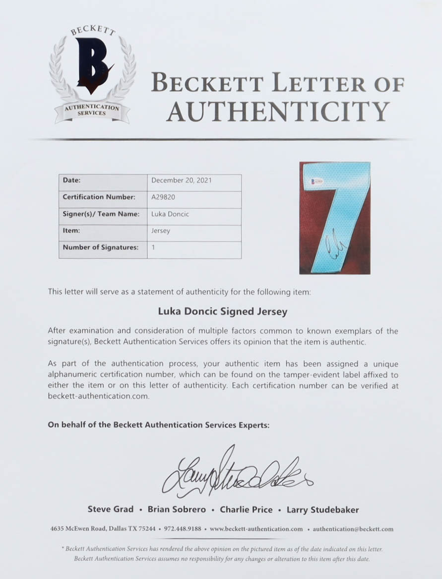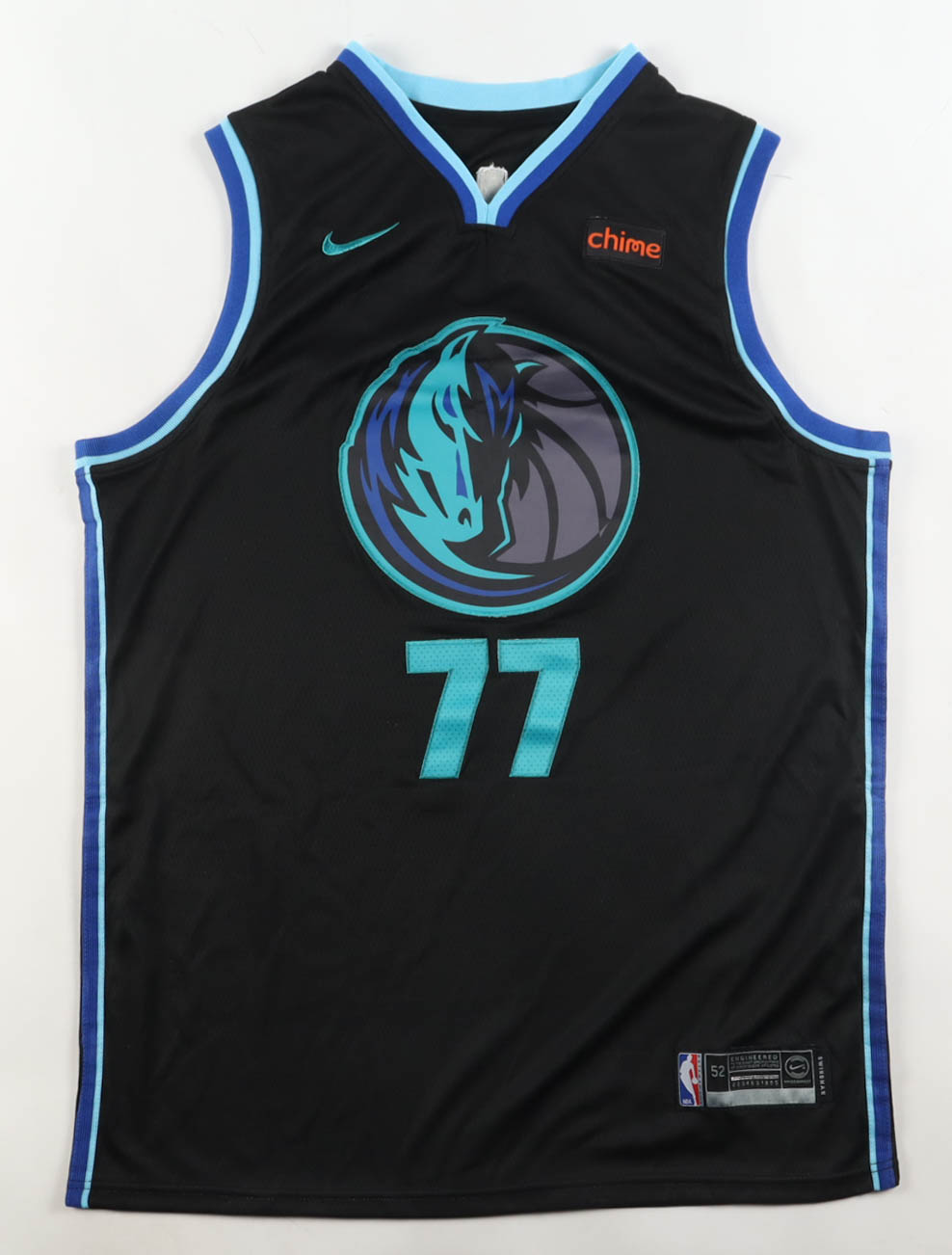 Nike authentic jersey with everything pressed on, size 52. Hand-signed by Luka Doncic (Dallas Mavericks).