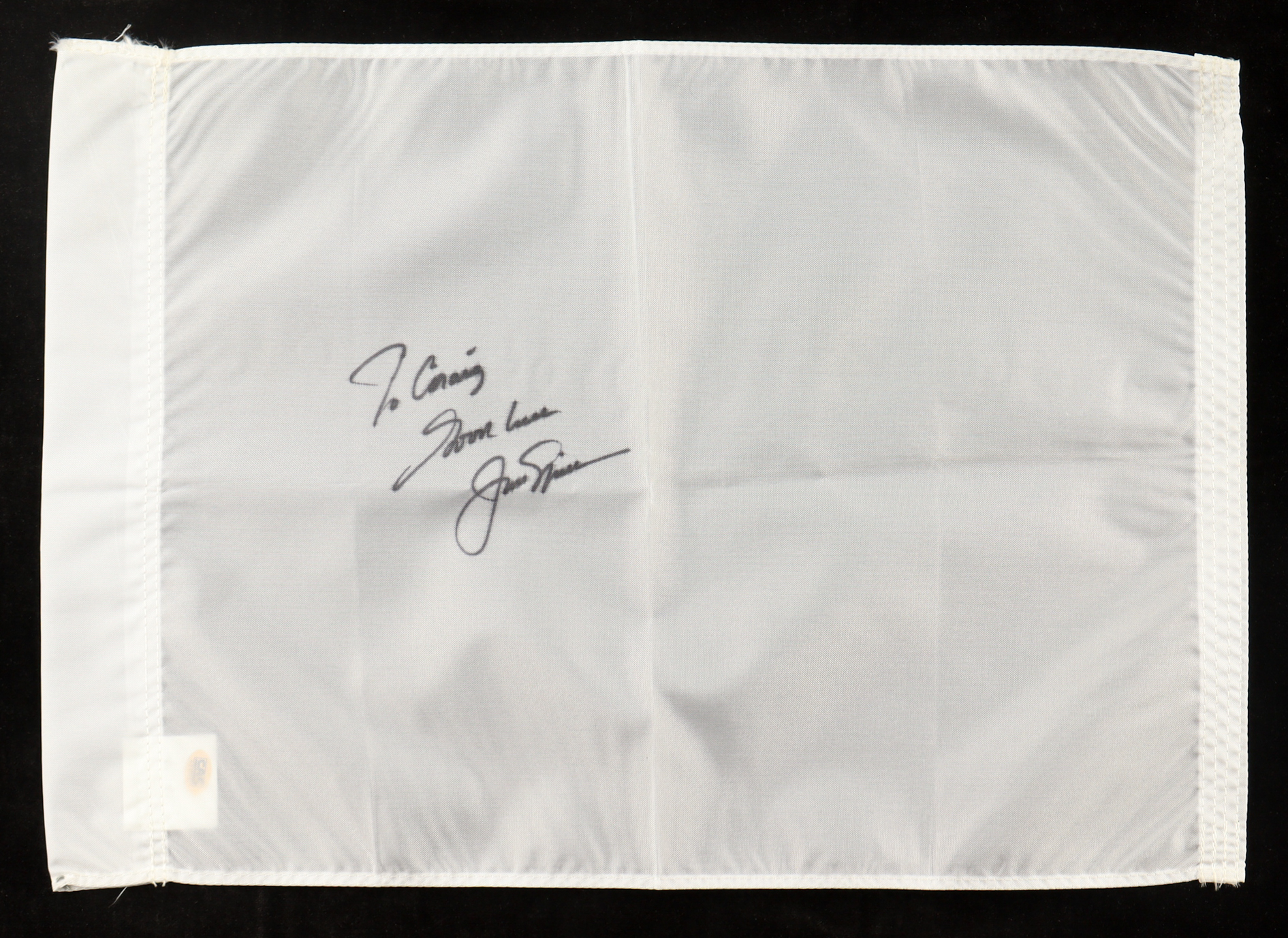 Pin flag measures approximately 14" x 19.25" in size and has been hand-signed and inscribed by Jack Nicklaus (HOF). Please note, this item contains a personalization.