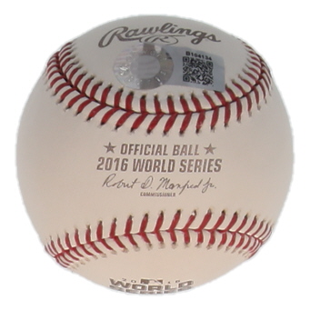 Rawlings Official 2016 World Series Logo baseball has been hand-signed and inscribed by Travis Wood (Chicago Cubs).