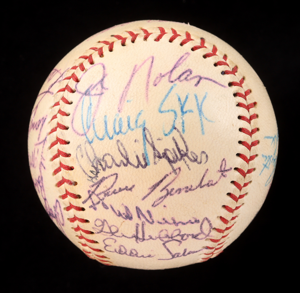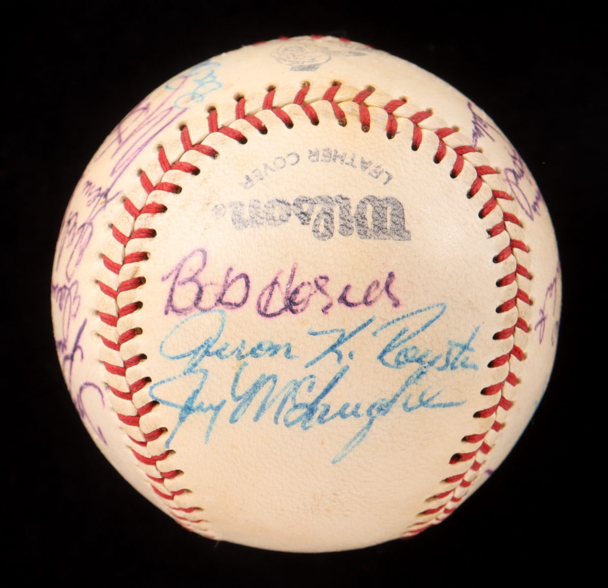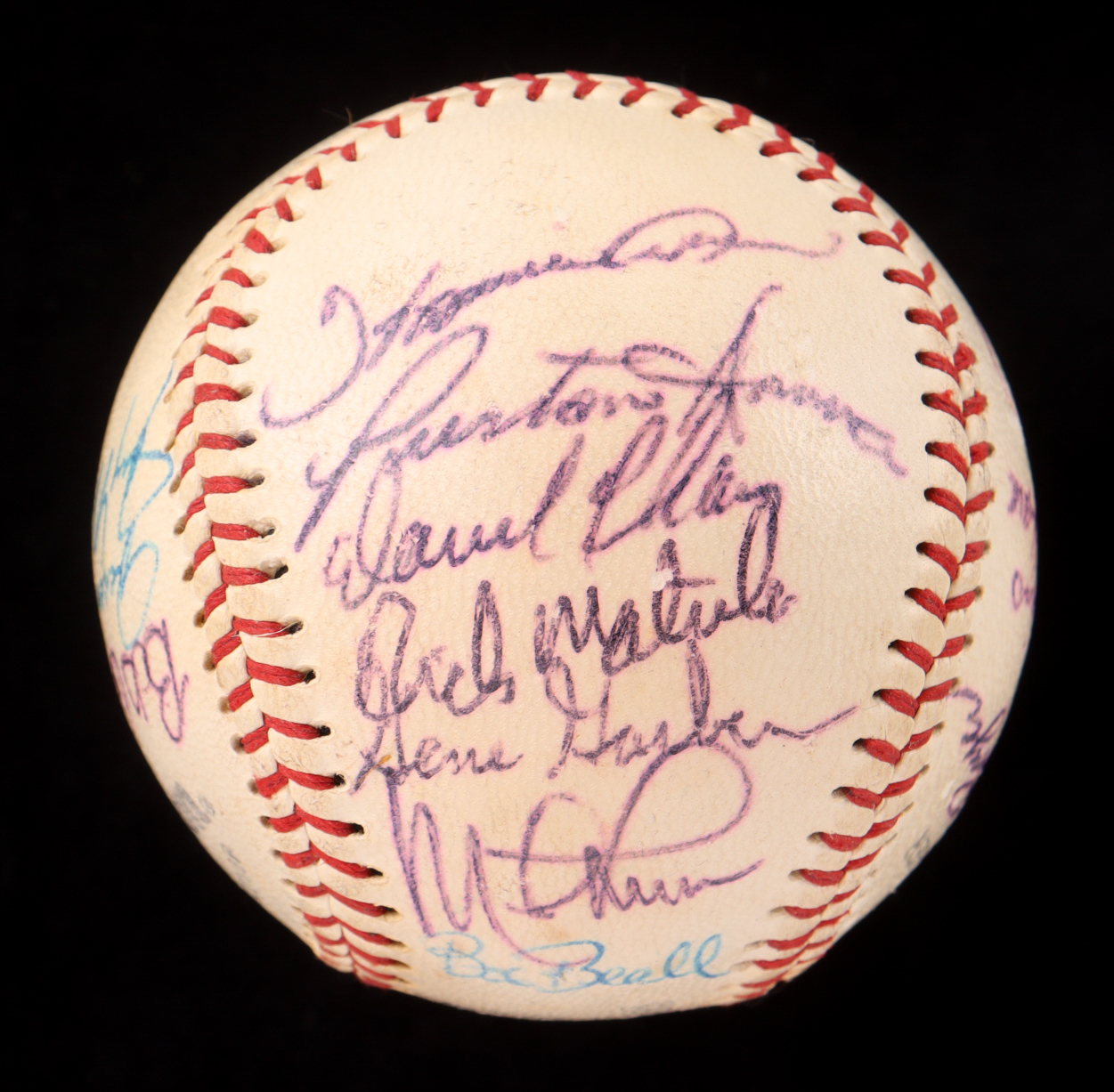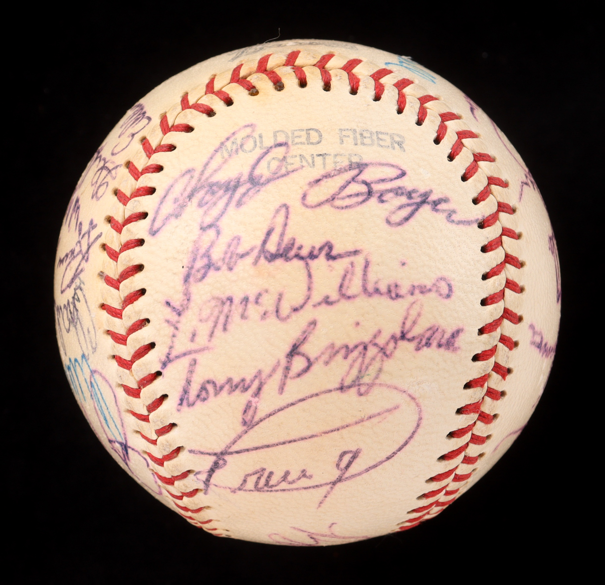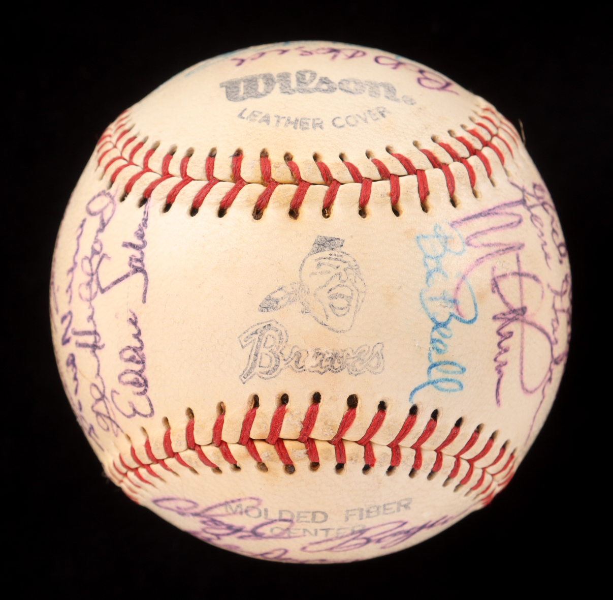 Wilson Atlanta Braves Logo baseball. Hand-signed by (23) including Bobby Cox (HOF), Tommie Aaron (D. 1984), Mike Lum, Preston Hanna (D. 2023), Gene Garber, Bob Beall, Rick Matula, Darrel Chaney, Eddie Solomon (D. 1986), Glen Hubbard, Phil Niekro (D. 2020, HOF), Charlie Spikes, Bruce Benedict, Craig Skok, Joe Nolan, Cloyd Boyer (D. 2021), Bobby Dews (D. 2015), Larry McWilliams, Tony Brizzolara, Bob Horner, Jerry Royster, Pepe Frias, and Joey McLaughlin. Please note, the baseball is stained, naturally toned and the some of the signature have bled.
