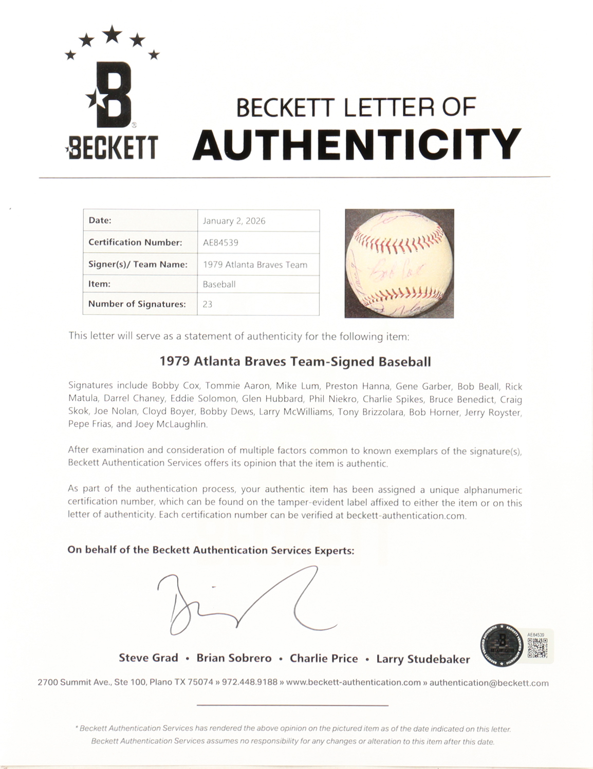1979 Braves Baseball Team-Signed by (23) with Bobby Cox, Phil Niekro, Bob Horner, Darrel Chaney (Beckett)