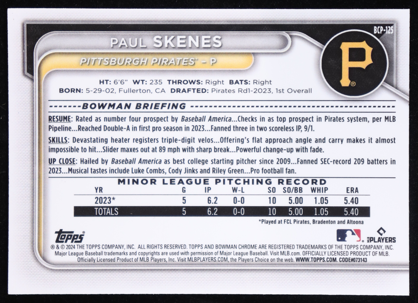 Paul Skenes 2024 Bowman Chrome Prospects #BCP-125 RC
