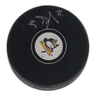 Pittsburgh Penguins Logo Hockey Puck. Hand-signed by Evgeni Malkin. Please note, the signature has been smudged and there are stains throughout the puck.