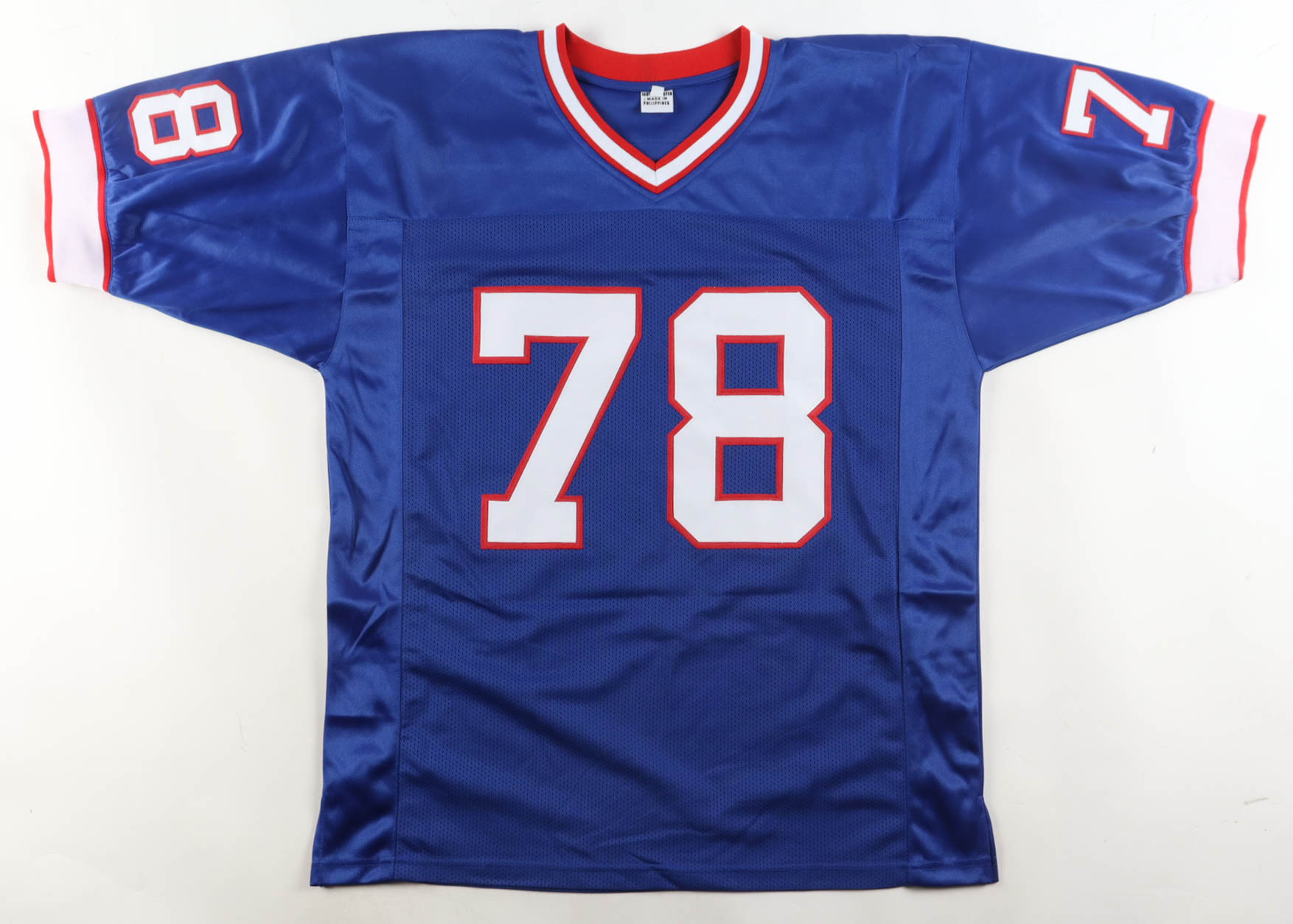 Custom jersey with everything sewn on, size XL. Hand-signed by Bruce Smith (HOF).