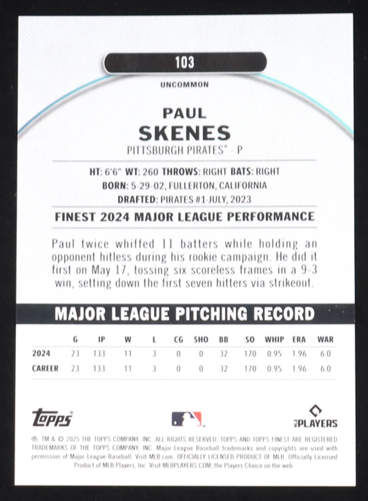 Paul Skenes 2025 Topps Finest Green Refractors #103 #32/35