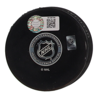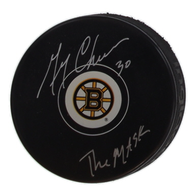 Boston Bruins Logo Hockey Puck. Hand-signed and inscribed by Gerry Cheevers (HOF).