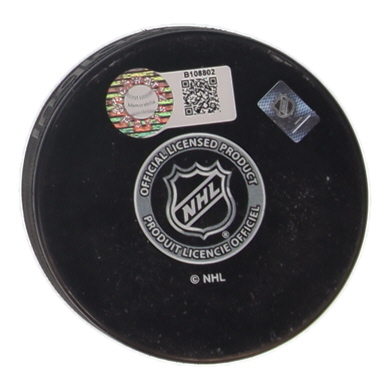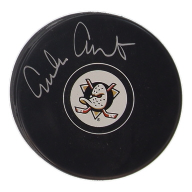 Anaheim Mighty Ducks team logo hockey puck has been hand-signed by Emilio Estevez.