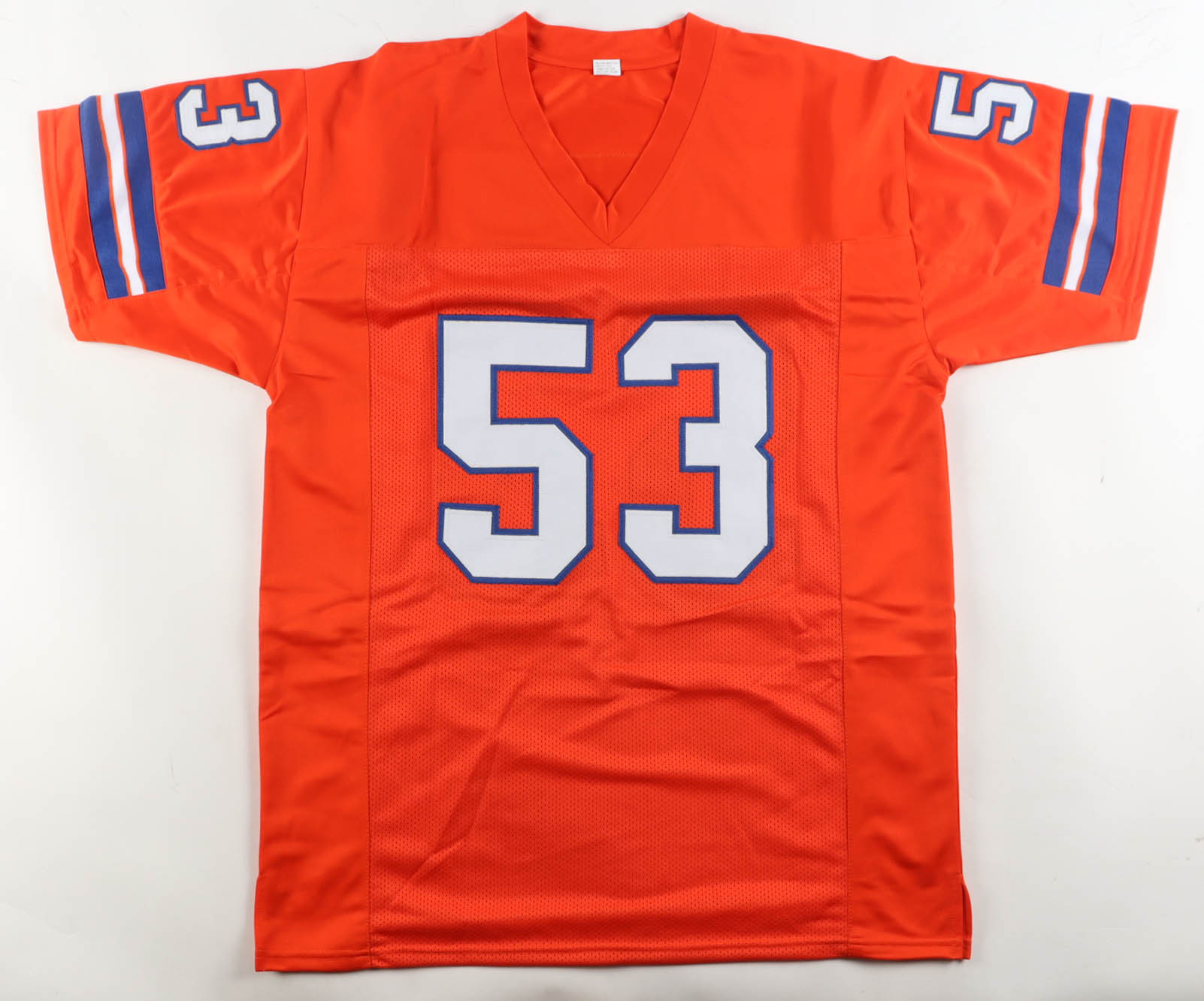 Custom jersey. Everything is sewn on, size XL. Hand-signed and inscribed by Randy Gradishar (HOF). Please note, the signature and inscription have bled.