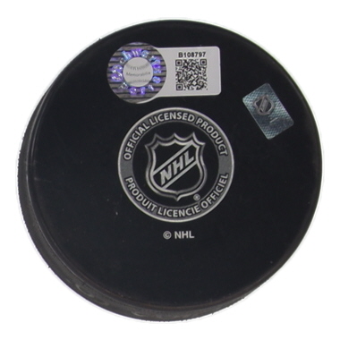 Montreal Canadiens logo hockey puck has been hand-signed and inscribed by Chris Chelios (HOF).