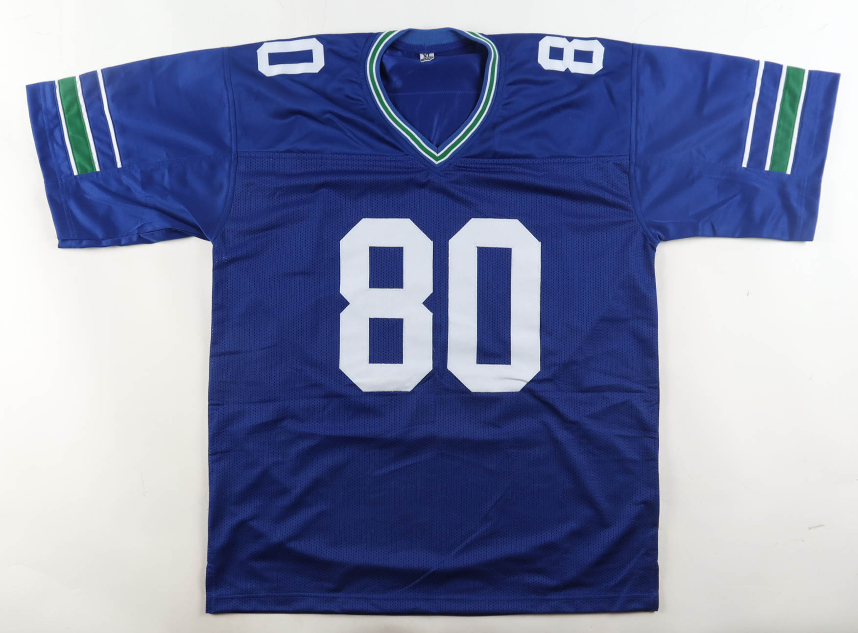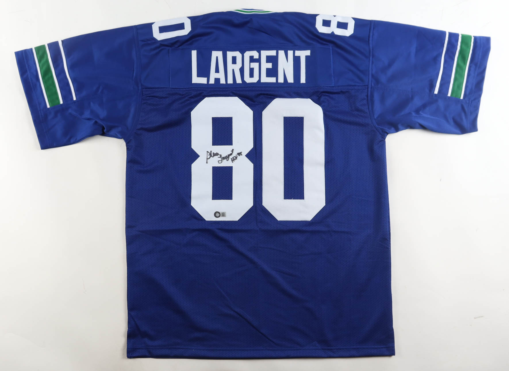 Custom jersey with everything sewn on, size XL. Hand-signed and inscribed by Steve Largent (Seattle Seahawks, HOF).