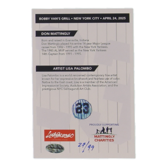 New York Yankees Rini Art PostCard, hand-signed by Don Mattingly. Item is limited edition #27/99. Please refer to photos for more details on the condition of the item.