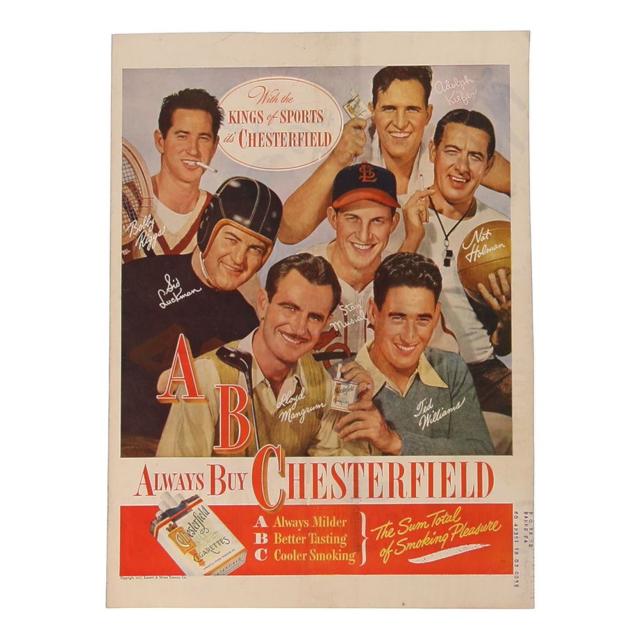 1947 Vintage Original Chesterfield Cigarettes 11x14 Poster Featuring Ted Williams and Stan Musial