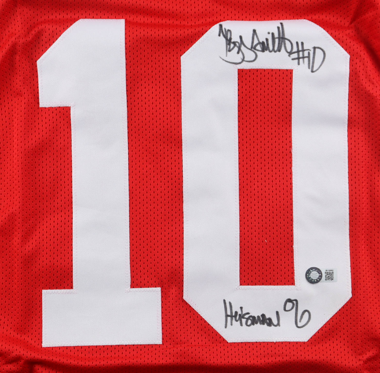 Custom jersey with everything sewn on, size XL. Hand-signed and inscribed by Troy Smith.