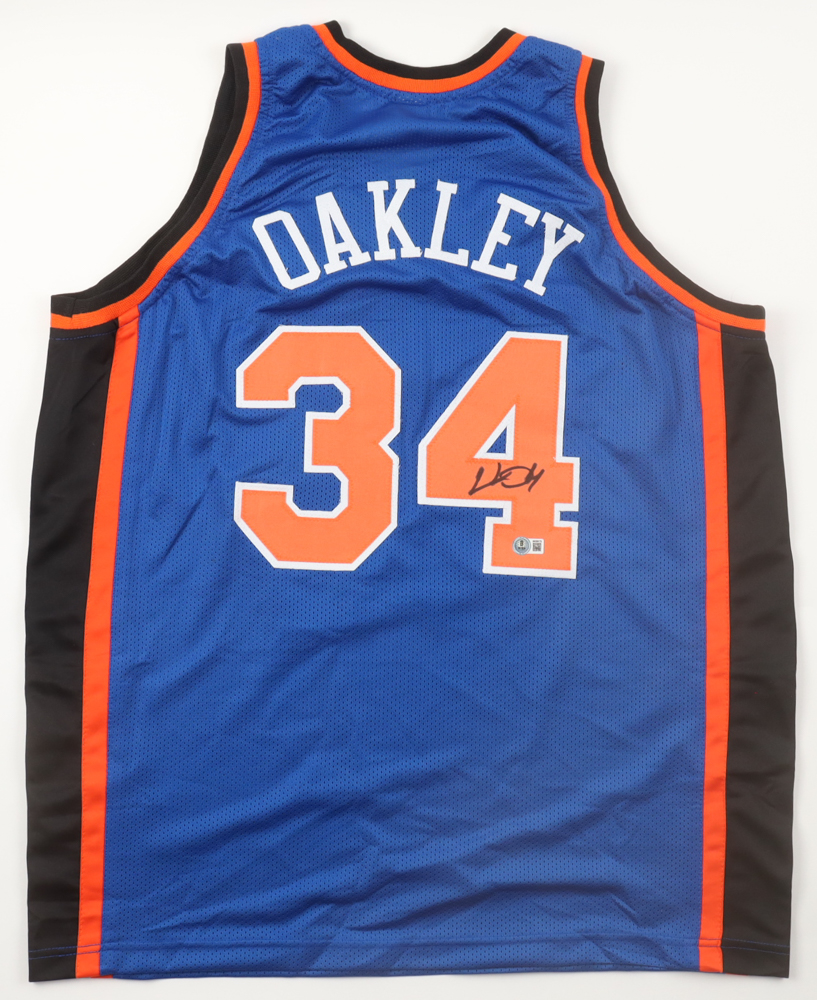 Custom jersey with everything sewn on, size XL. Hand-signed by Charles Oakley.