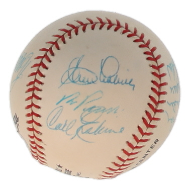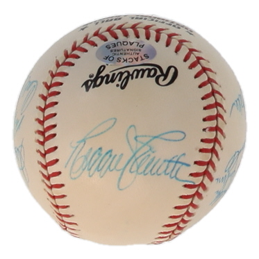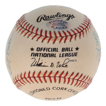 Rawlings Official National League baseball. Hand-signed by Duke Snider, Preacher Roe, Carl Erskine, Ralph Branca, Clem Labine, Dusty Baker, Ron Peronoski, Sweet Lou Johnson, Bill Russell, Reggie Smith, Wes Parker And Ken McCullen. Please note, the baseball is naturally toned
