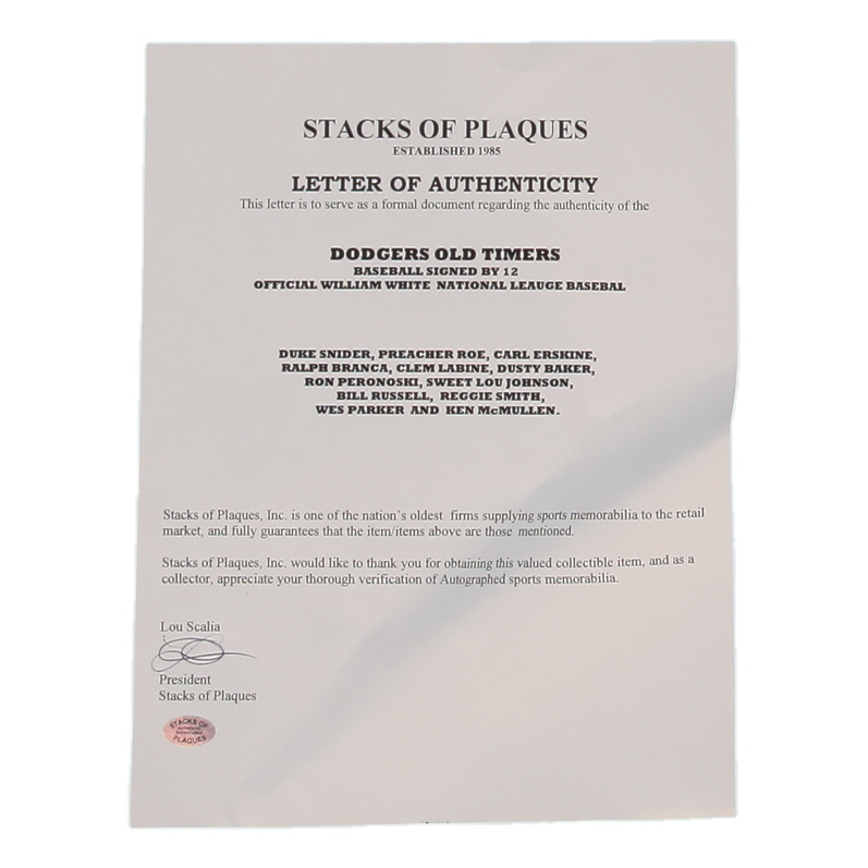 Dodgers Old Timers ONL Baseball Signed by (12) with Duke Snider, Preacher Roe, Carl Eskrine, Ralph Branca (Stacks of Plaques)