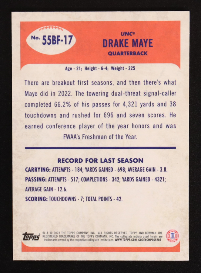 Drake Maye 2023 Bowman Chrome University '55 Bowman #55BF17 RC