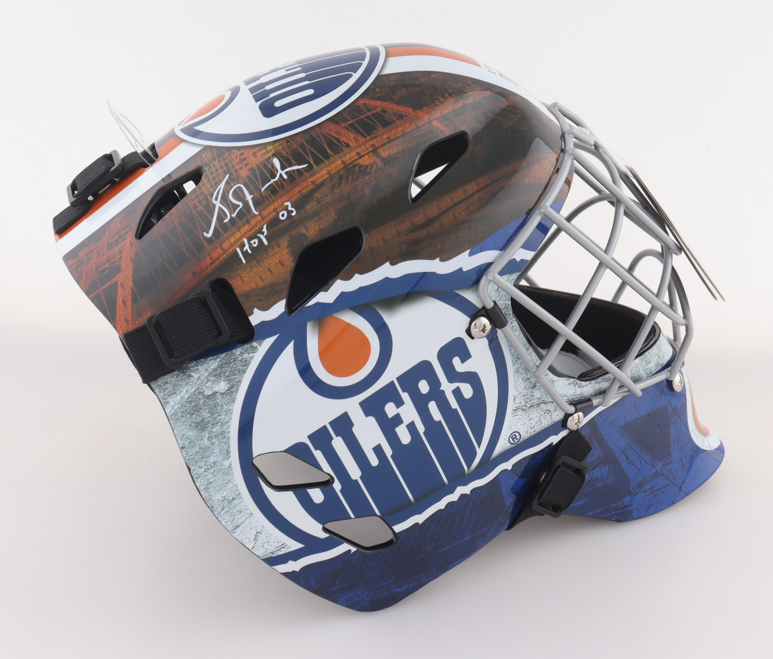 Edmonton Oilers goalie mask has been hand-signed and inscribed by Grant Fuhr (HOF).