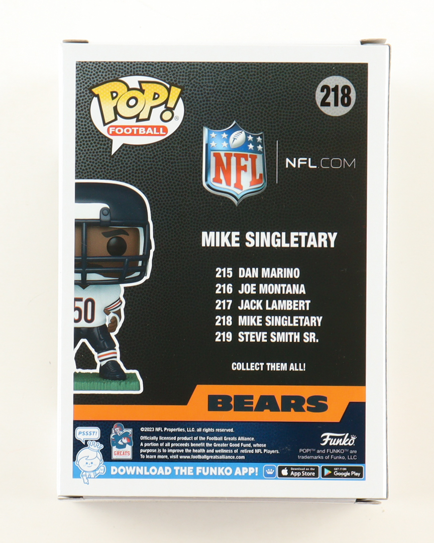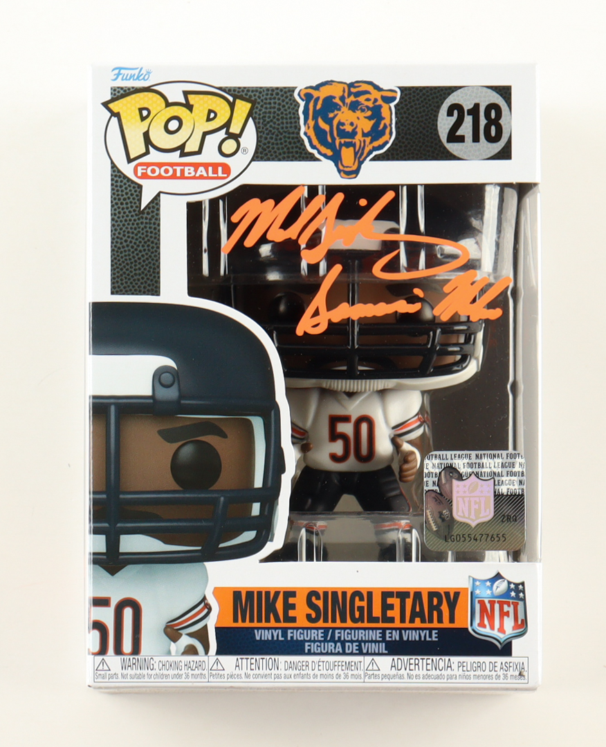 Funko Pop! vinyl figure measures approximately 4" in height and has been hand-signed on the packaging by Mike Singletary (Chicago Bears, HOF).