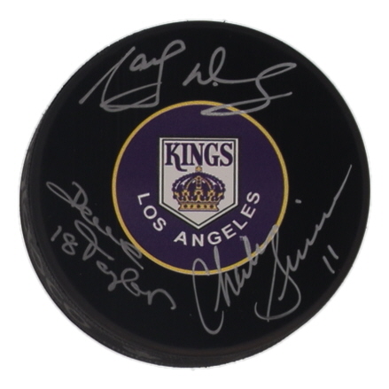Los Angeles Kings Logo Hockey Puck. Hand-signed by Dave Taylor, Charlie Simmer, and Marcel Dionne (HOF). Please note, there are minor stains throughout the puck.