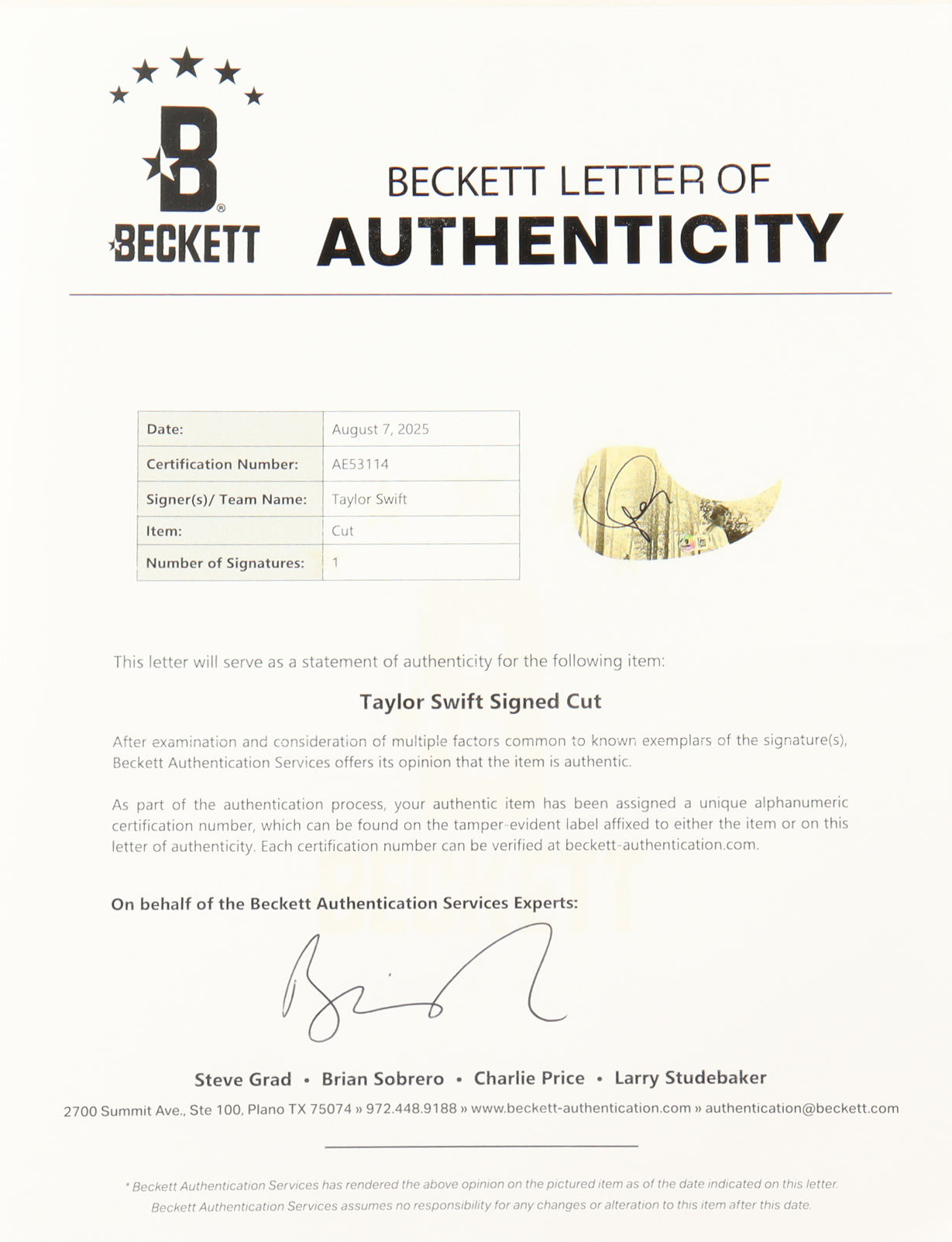 The autograph includes an official Beckett Authentication Services hologram and matching LOA for authenticity purposes.