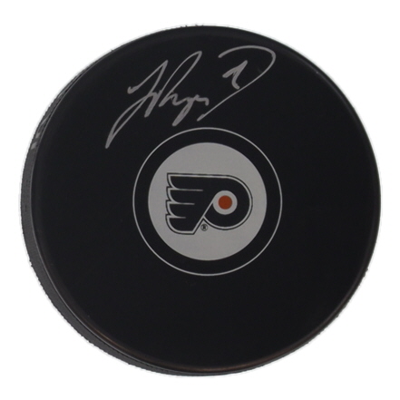 Philadelphia Flyers Logo Hockey Puck. Hand-signed by Jamie Drysdale. Please note, there are stains throughout the puck.