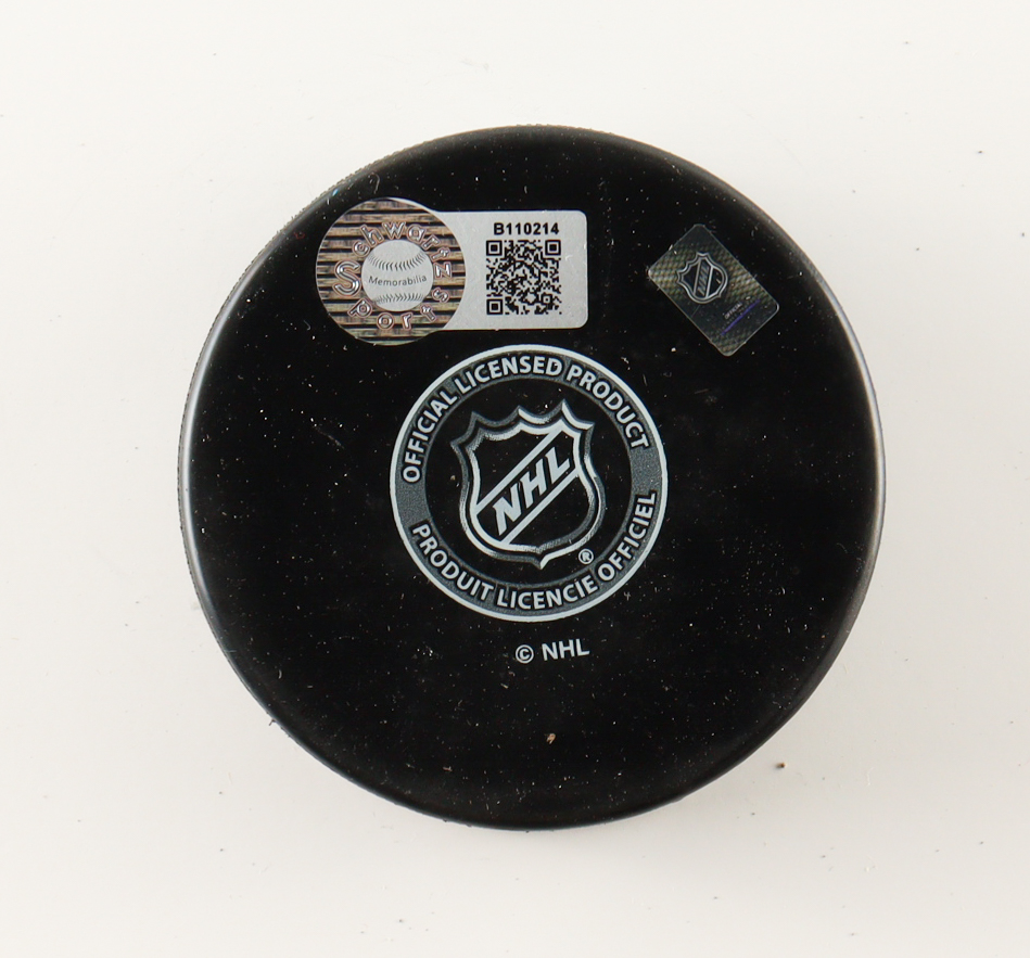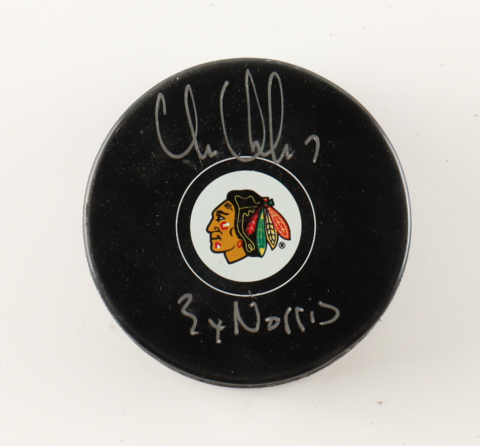 Chicago Blackhawks Logo Hockey Puck. Hand-signed and inscribed by Chris Chelios (HOF).