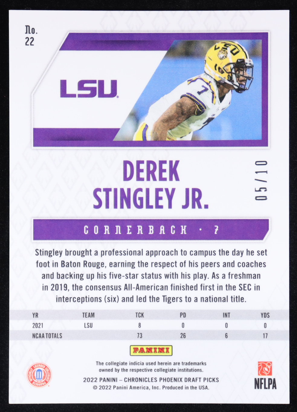 Derek Stingley Jr. 2022 Panini Chronicles Draft Picks Phoenix Gold #22 #05/10 RC