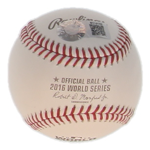 Rawlings Official 2016 World Series Logo baseball has been hand-signed and inscribed by Travis Wood (Chicago Cubs).