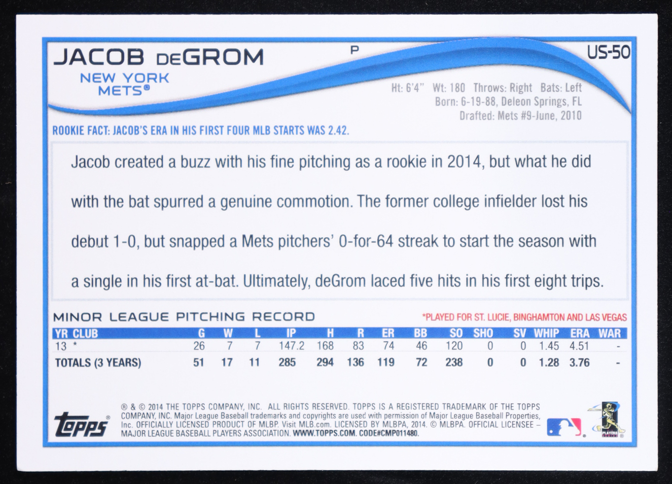 Jacob deGrom 2014 Topps Update #US50A RC
