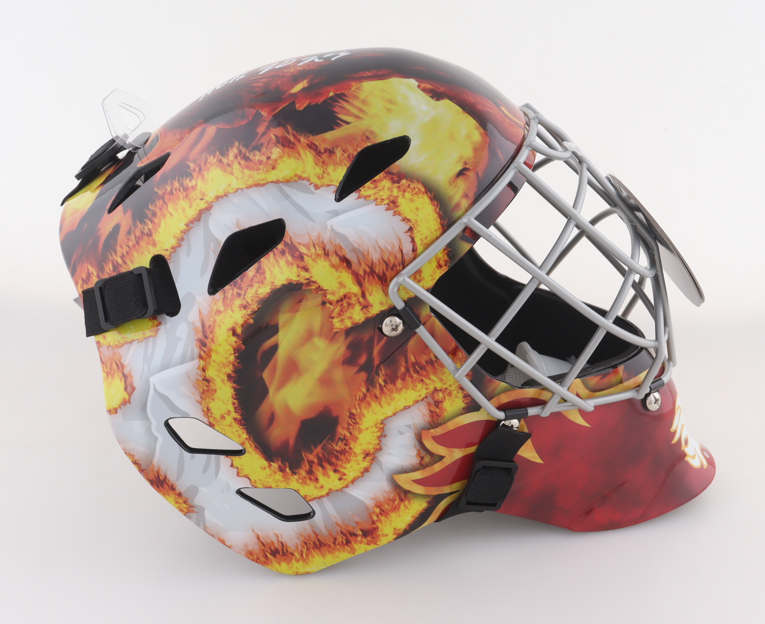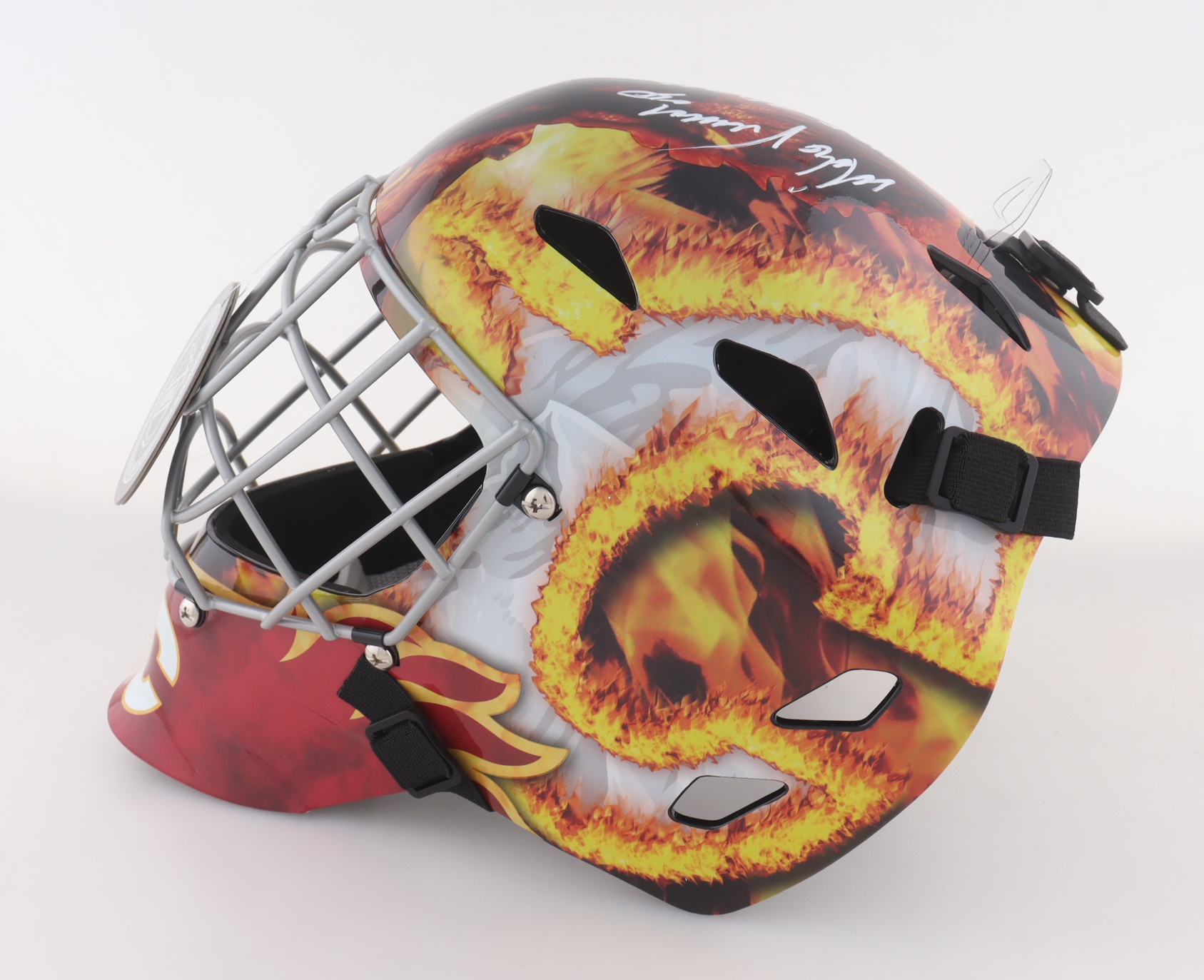 Franklin Calgary Flames Full-Size goalie mask has been hand-signed and inscribed by Mike Vernon (HOF).