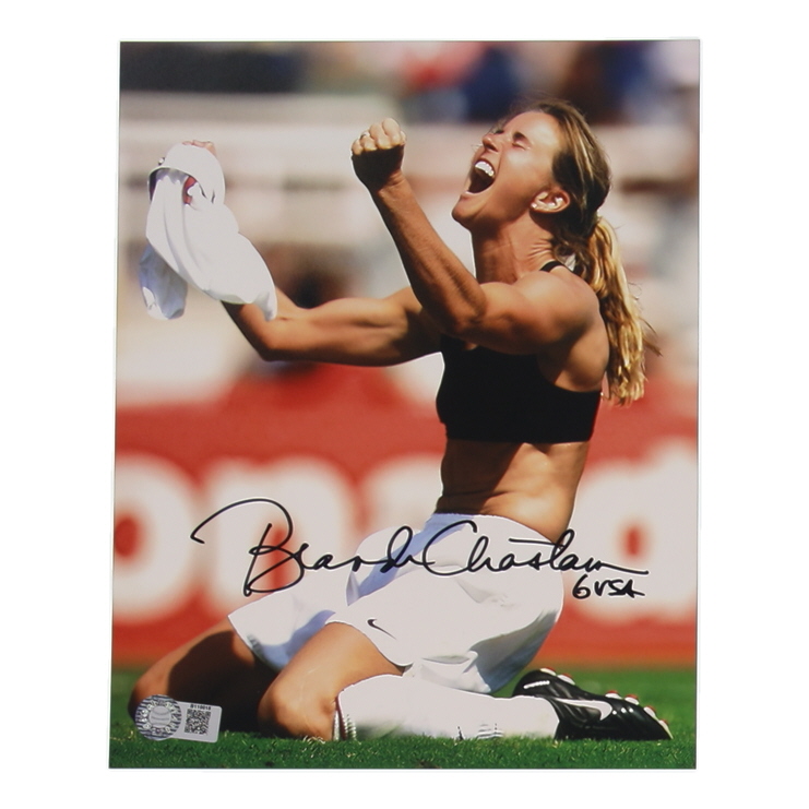 Photo measures 8" x 10" in size and has been hand-signed and inscribed by Brandi Chastain (HOF).