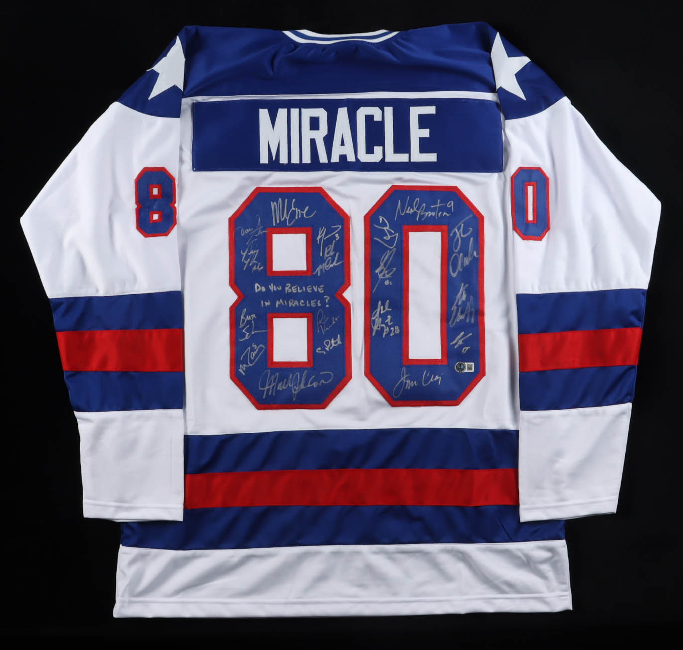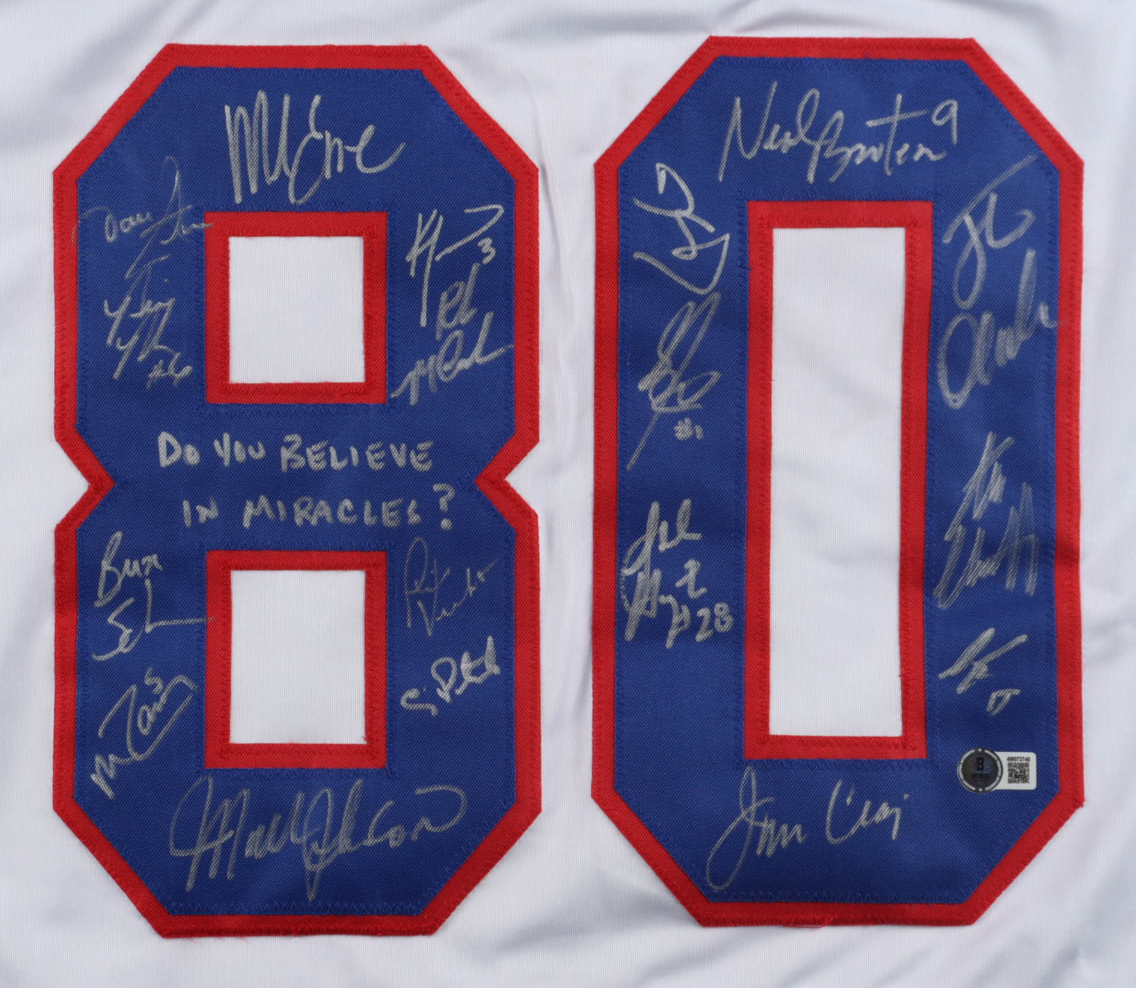 1980 Team USA | "Miracle on Ice" | Jersey Signed by (18) with Mike Eruzione, Jim Craig, Mark Johnson, Neal Broten Inscribed "Do you Believe in Miracles?" & "1980 Gold" (Beckett)